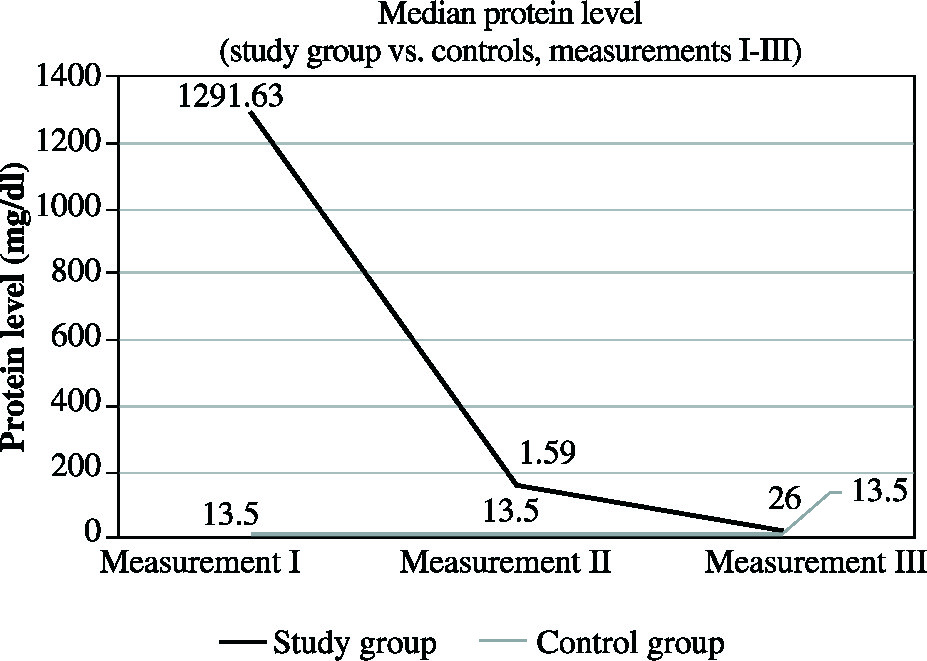Comparison of median CSF protein in the study group vs. controls in three consecutive measurements