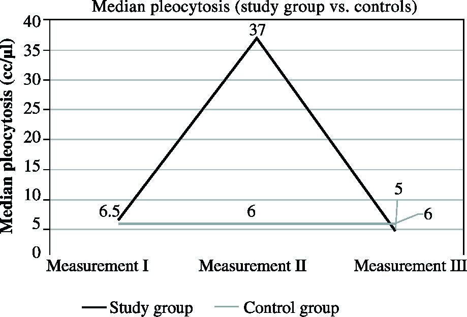 The study group included children with congenital hydrocephalus. Patients were hospitalized because of primary VPS infection. In all cases, the etiological factor was Staphylococcus epidermidis. Infections caused by other factors were excluded from the study. The material includes 30 pediatric patients, successively admitted and operated in the Polish Mother’s Memorial Hospital Research Institute (PMMHRI) between 2010 and 2014.In all cases, VPS was removed (including intraventricular and peritoneal catheter) and external ventricular drainage EVD implanted. The intraventricular catheter was exchanged to eliminate the biofilm. The first CSF sample (measurement I) was taken at diagnosis (clinical symptoms of VPS malfunction and positive CSF culture). Adequate antibiotic therapy was implemented according to the antibiogram. After receiving the first sterile CSF culture, two additional samples were taken to obtain three sterile samples of CSF culture. To assess bacterial growth from a sample, specimens were drawn for culture on average once a week. Therefore, the time between the first and the second measurement depended on the results of microbiological examination of CSF samples. When the condition of three sterile CSF cultures was fulfilled, the second CSF sample was taken (measurement II). Patients were eligible for VPS reimplantation when CSF protein level was ≤ 100mg% and pleocytosis did not exceeded 100 cc/µl.If these criteria were not fulfilled, the CSF was re-examined once a week, until satisfactory results were obtained. The third CSF sample was taken during the surgical procedure (measurement III). For safety reasons, during each procedure, only 5 mL of CSF was taken from the ventricular system. All CSF specimens were stored at –80°C. All CSF samples were frozen immediately in order to preserve stability. Before analysis, samples were heated to –20°C and then to room temperature. The CSF was centrifuged at 2,000 rpm for 10 min to eliminate cellular components and 2.0 ml of supernatant were removed. The following quantitative assessments were performed using the ELISA method. Ready-made standardized sets made by R&D Systems, Inc.; 614 McKinley Place NE; Minneapolis, MN 55413, USA (enzyme immunoassay) were used. Absorbance reading of the test samples was performed using a microplate DS2 Dynex Technologies, Inc., USA reader. This test is performed using cell culture supernatants as this method of evaluation is more sensitive compared to the tests using blood serum. Physiological saline was used as the negative control. Absorbance values for each sample were read at a wavelength of 450 nm. Concentration values of the test samples were calculated automatically from the standard curve. Assessments in the following material were made, and the sensitivity of the test, i.e. the minimal detectable concentration was 0.20-0.31 ng/ml. The control group included 30 pediatric patients who underwent first-time VPS implantation (measurement-control). Patients with hydrocephalus due to inflammation, hemorrhage, or tumor were excluded from the group. Similarly, excluded were all patients eligible for treatment by neuroendoscopic techniques at any time of therapy. In the study group, parameters such as MBP, IL-6 levels, pleocytosis, and protein values obtained during the subsequent measurements were compared using variance analysis. Bonferroni post hoc analysis was used to verify significant differences between measurements. Parameters in the study group obtained in each of three measurements (measurement I, measurement II, and measurement III) were compared to corresponding parameters in the control group. In this case, Friedmann test was used (post-hoc Wilcoxon test with Bonferroni correction for the number of comparisons). Normal distribution of measured parameters was checked using the Kolmogorov-Smirnov test with Lilliefors correction. The homogeneity of variances was tested with the Mauchly test. If variances were not homogeneous, the Greenhouse-Geisser correction was used. As the level of statistical significance, p< 0.05 was used. For the whole statistical analysis, SPSS 17.0 software was applied. This research was funded by the National Science Centre programme No. N N403 242440. It was approved by the Ethical Committee of the Polish Mother’s Memorial Hospital Research Centre.