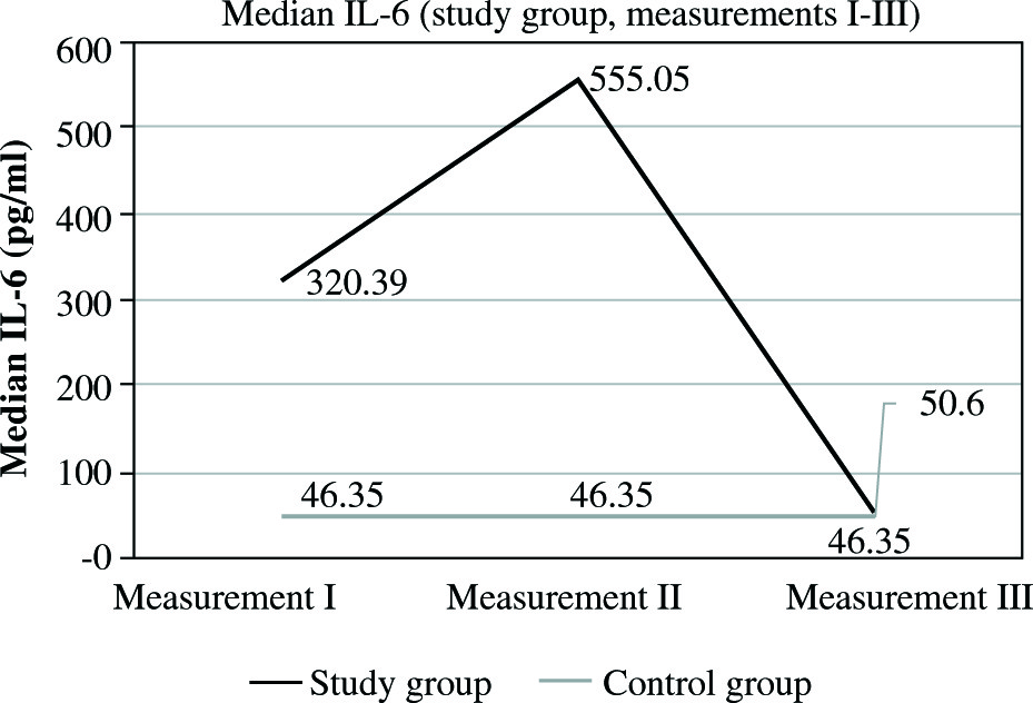 In the study group, the mean protein level at this time was 1291.63 mg/dl, SD ±497.80 mg/dl, and median 1291.63 mg/dl. The levels were significantly higher than in all other measurements (measurement II and III, p< 0.001) in analyzed group. It was also significantly higher than in the control group, where the mean CSF protein value was 17.47 mg/dl, SD ±9.24 mg/dl, and median 13.50 mg/dl (Fig. 2, Tables 1 and 2). In the second measurement, mean protein concentration was 179.83 mg/dl, SD ±83.12 mg/dl, with median 159 mg/dl. These values were lower compared to those obtained in the first measurement, and higher than those in the third measurement. In both cases, p< 0.001 (Fig. 2, Tables 1 and 2). The CSF protein values in the third measurement included mean 35.30 mg/dl, SD ±25.20 mg/dl, and median 26 mg/dl. They remained higher than the corresponding values in the control group (p = 0.013) (Fig. 2, Tables 1 and 2). In the control group, mean protein levels were 17.47 mg/dl, SD ±9.24 mg/dl, and median 13.50 mg/dl. The results obtained for pleocytosis followed a different pattern. In the first measurement, the mean pleocytosis level was 7.90 cc/µl, SD ±7.8 cc/µl, and median 6.50 cc/µl. Similar values were obtained in the control group (p = 0.953). The highest pleocytosis value was found in the second measurement. The mean value was 106.03 cc/µl, SD ±145.21 cc/µl, and median 37 cc/µl (Fig. 3, Tables 1 and 2). At that time, none of the 30 patients in the study group was eligible for VPS reimplantation because of elevated protein and pleocytosis. Pleocytosis levels in CSF of patients in the study group were significantly higher in comparison to controls (p = 0.001). In the third measurement, the mean pleocytosis level was 13.10 cc/µl, SD ±19.53 cc/µl, median 5 cc/µl (Fig. 3, Tables 1 and 2), comparable to the values in the control group(p = 0.953) (Fig. 3, Tables 1 and 2). In the control group, the pleocytosis level was 7.83 cc/µl, SD ±6.81 cc/µl, and median 6 cc/µl (Fig. 3, Tables 1 and 2). The intensity of the inflammatory process initiated by bacterial invasion was measured using CSF levels of IL-6. The results were higher than those in the control group from the first measurement (median 320.39 pg/ml, mean 393.98 pg/ml, SD ±296.92 pg/ml) (Fig. 4, Tables 1 and 2). The peak value of IL-6 was noted in the second measurement, with median 555.05 pg/ml and mean value of 8107.09 pg/ml, SD ±21809.43 pg/ml (Fig. 4, Tables 1 and 2). In the third measurement, there was no statistically significant difference between the study group and controls. In study subjects, the median level of IL-6 was 50.60 pg/ml, mean 101.14 pg/ml, and SD ±131.36 pg/ml (Fig. 4, Tables 1 and 2). In the control group, mean IL-6 value was 48.41 pg/ml, SD ±11.81, and median 46.35 pg/ml (Fig. 4, Tables 1 and 2). In the second measurement between MBP and IL-6, a strong positive correlation was observed (correlation index, 0.7350; p< 0.05). Furthermore, in the same measurement, a positive correlation between MBP and pleocytosis was noted (correlation index: 0.1291, p< 0.05). No quantitative relationship was found between MBP and protein level in CSF (correlation index, 0.0094; p< 0.05).