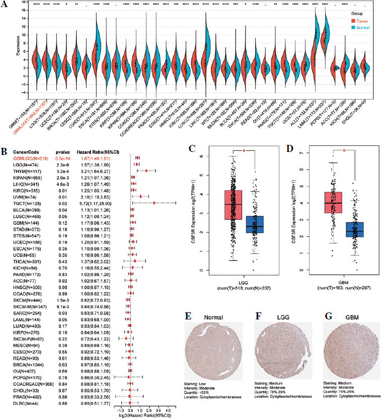 Expression of CSF3R in pan-cancer and in glioma. A) Expression of CSF3R between the 34 cancers and normal tissues in unpaired sample analysis. B) Expression of CSF3R is associated with poorer overall survival (OS) in tumor patients. C, D) Expression of CSF3R in low-grade glioma (LGG) and GBM compared with normal tissues. E-G) Expression of CSF3R in LGG and glioblastoma (GBM) from HPA