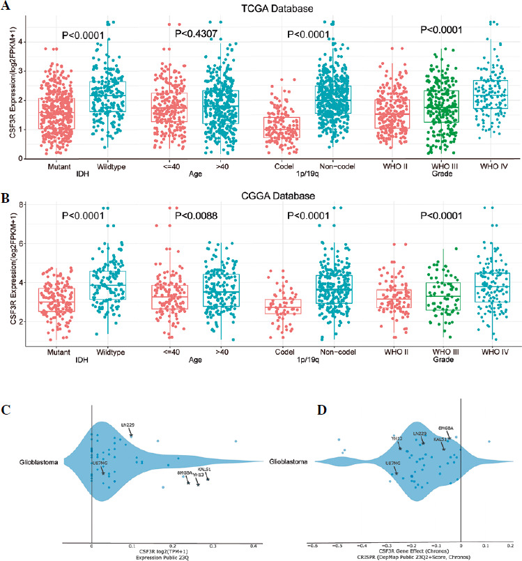 Expression of CSF3R is associated with the clinical characteristics of gliomas as well as the survival rate of glioma cells. A, B) Expression of CSF3R is significantly correlated with IDH mutation, 1p/19q codeletion status, and WHO grading, with no apparent correlation with age. C) Expression profile of CSF3R across different glioma cell lines, with log2 (TPM+1) values above 0 indicating high expression. D) Representation of CRISPR-mediated knockout of CSF3R in glioma cell lines, depicting cell viability. A score below 0 signifies CSF3R gene knockout and reduced cell survival rate