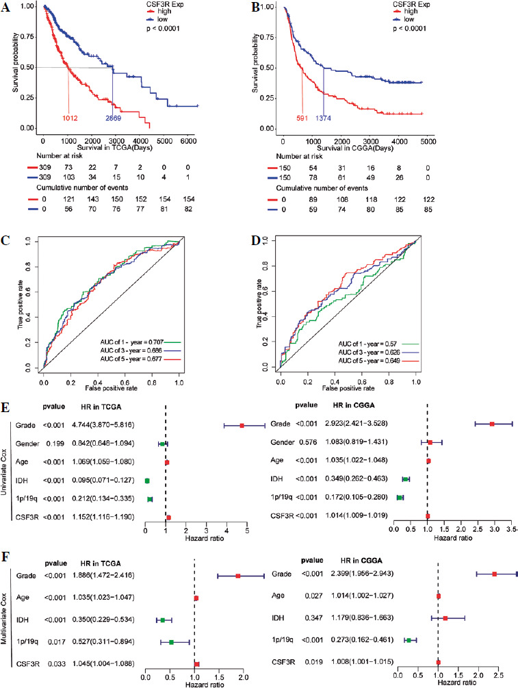 Potential prediction of CSF3R as a prognostic factor for glioma. A, B) Kaplan-Meier survival analysis showed that in the TCGA and CGGA databases, patients with high CSF3R expression had lower overall survival (OS). C, D) ROC curve for the predictive efficiency of Kaplan-Meier survival curves. E, F) Univariate and multivariate analysis indicated that CSF3R could be used as an independent prognostic factor in glioma