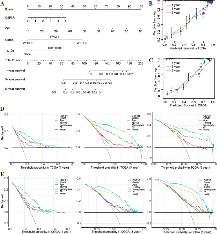 Nomogram and decision curve analysis (DCA) curves. A) The nomogram was constructed with WHO grade, age, and CSF3R expression in the TCGA cohort. B, C) The calibration plots: verify the accuracy of the predicted 1-, 3- and 5-year overall survival (OS) in the nomogram. D, E) DCA curves: CSF3R, grade, age and 1p19q curves represent their own prognostic value. Nomogram curve represents the synthetical prognostic value of CSF3R, grade, age and 1p19q. No curve represents no prognostic value. All curve represents the theoretical best prognostic value