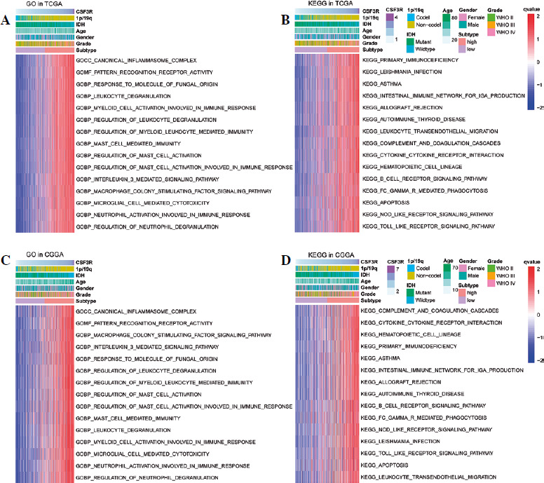 To explore the biological roles of CSF3R, the samples from TCGA and CGGA datasets were categorized into high and low expression clusters according to the median CSF3R expression level. Subsequently, we observed a significant correlation between elevated CSF3R expression and immune response and inflammatory reaction, including primary immunodeficiency, intestinal immune network for immunoglobulin A (IgA) production, cytokine receptor interaction, mast cell mediated immunity, pattern recognition receptor activity, interleukin 3 mediated signaling pathway, canonical inflammasome complex, leukocyte degranulation, and neutrophil activation involved in the immune response (Fig. 5). These results suggested that CSF3R in gliomas may play a crucial role in regulating immune responses.