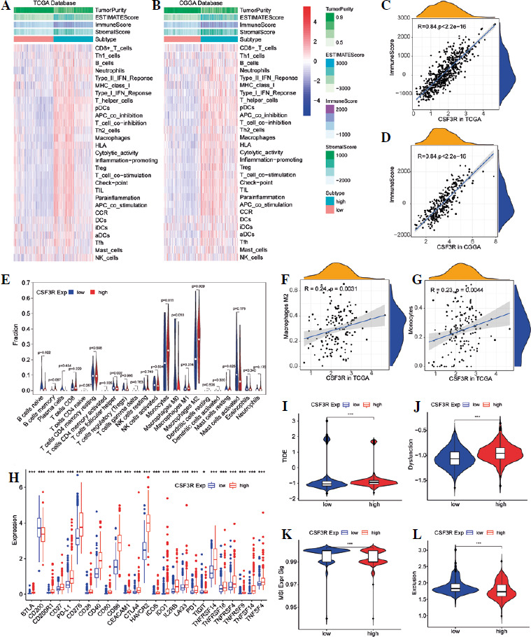 Association of CSF3R with immune regulation and immune treatment in glioma. A, B) Heatmaps of enrichment scores based on “immune signatures” in The Cancer Genome Atlas (TCGA) and Chinese Glioma Genome Atlas (CGGA) datasets. C, D) Correlation of CSF3R with ImmuneScore in TCGA and CGGA databases. E) Comparison of TIICs between the low and high CSF3R expression groups in TCGA and CGGA databases. F, G) Correlation of CSF3R with monocytes and M2 macrophages in TCGA and CGGA databases. H) Difference of immune checkpoint expression in low and high CSF3R subgroups in TCGA. I-L) TIDE, T cell dysfunction, MSI and T cell exclusion score in low and high CSF3R subgroups in TCGA