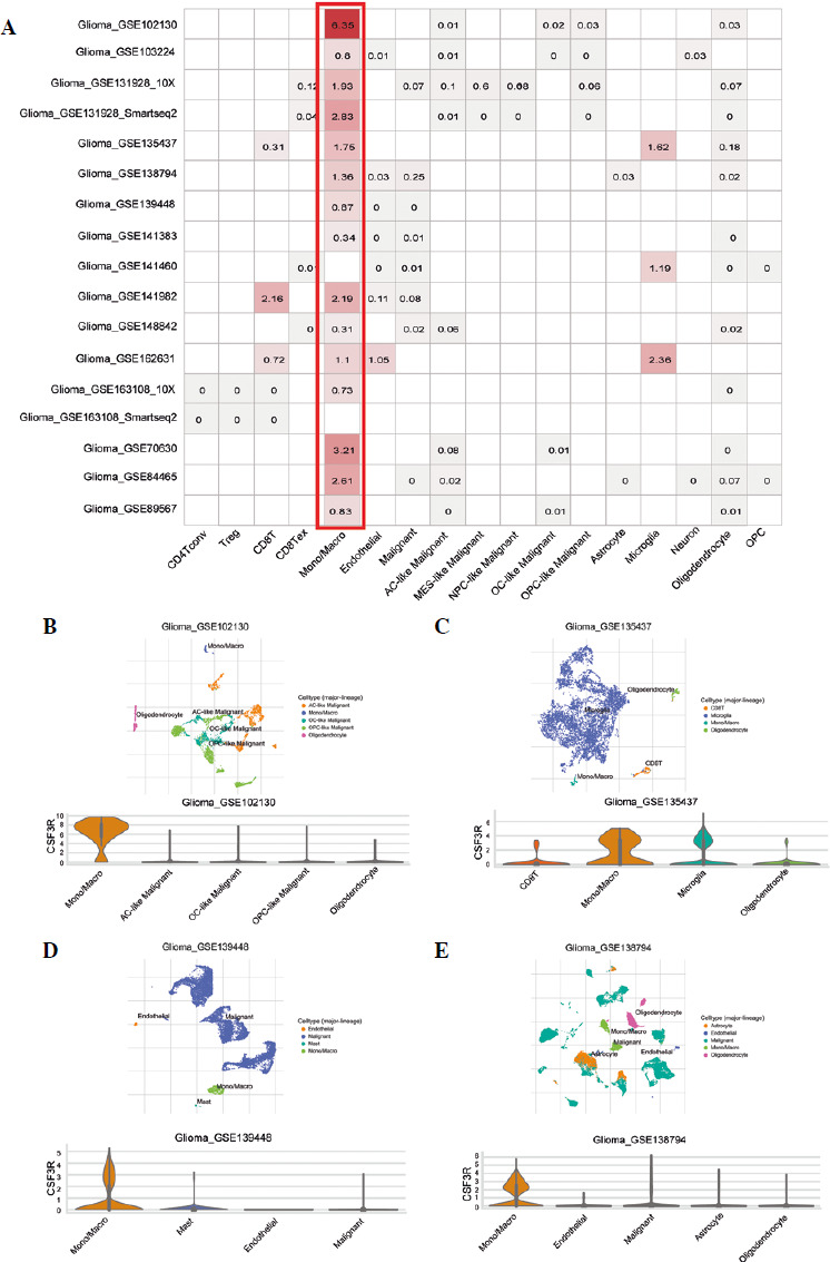 The aforementioned analysis outcomes implied a potential pivotal role of CSF3R in the tumor immune response. To ascertain the expression profiles of CSF3R across distinct cellular components within the tumor microenvironment, we proceeded to perform single-cell analysis of CSF3R utilizing the TISCH network tool. The range of CSF3R expression in a variety of cell types, including immune cells, stromal cells, malignant cells, and functional cells, is shown visually in Figure 7A. Notably, CSF3R exhibited predominant expression in monocytes/macrophages. In the GSE102130 dataset, which utilized single-cell RNA sequencing to analyze 4058 K27M-mutant glioma cells, CSF3R expression was primarily observed in monocytes and macrophages within the GBM microenvironment (Fig. 7B). Similarly, CSF3R was predominantly expressed in monocytes and macrophages in the GSE135437, GSE139448, and GSE138794 datasets (Fig. 7C-E). These results further emphasized the association between CSF3R and monocytes/macrophages in the tumor microenvironment. Therefore, the above information suggested that CSF3R may impact the immune processes of gliomas by regulating monocytes/macrophages.