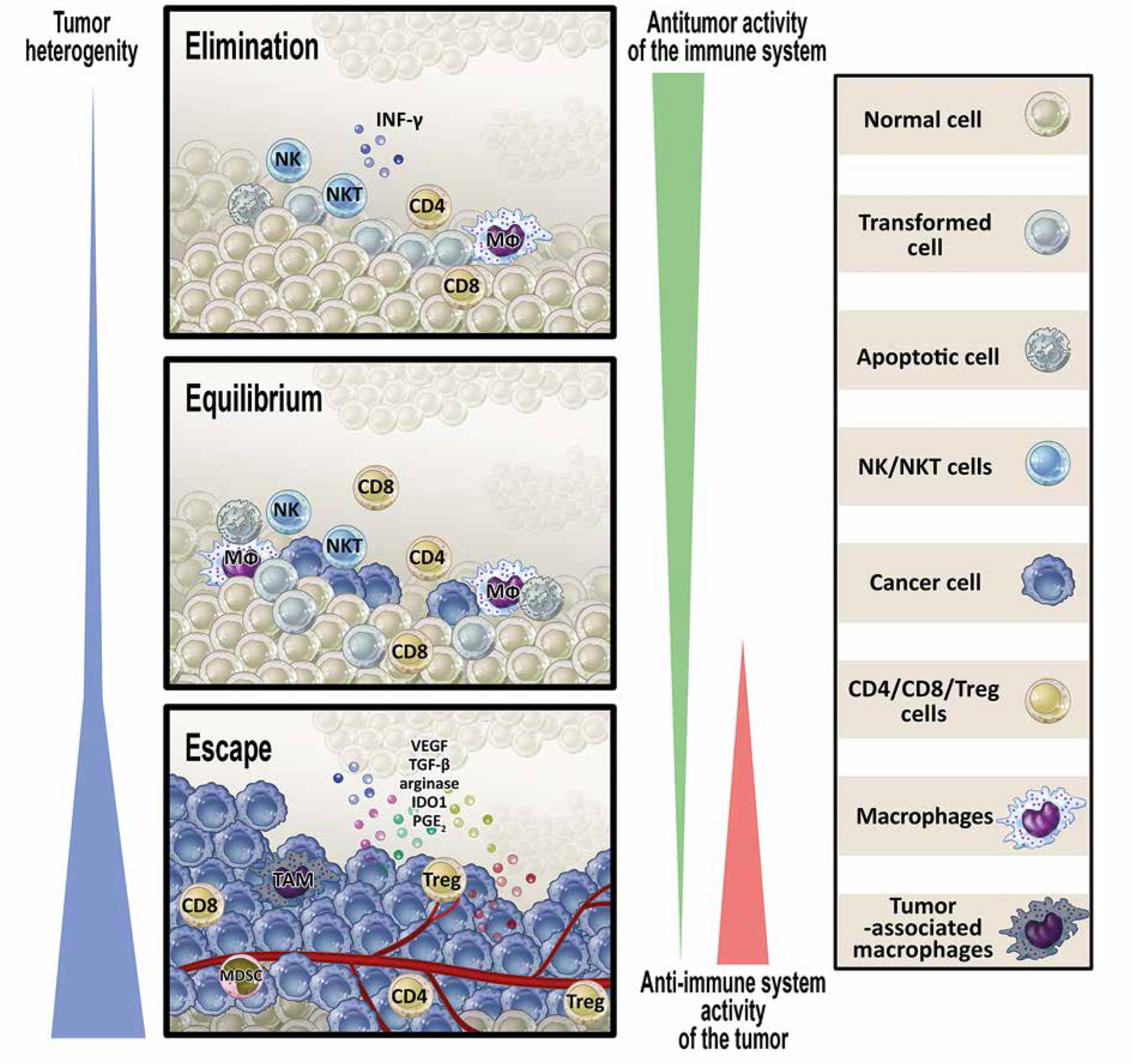 Relationships between transformed/tumor cells and the protective antitumor response – cancer immunoediting hypothesis. The process of cancer immunoediting consists of three stages: elimination, equilibrium, and escape. In the elimination phase, transformed cells are killed by antitumor effector mechanisms. Some of these cells can survive and enter the equilibrium phase in which variants of cancer cells are generated that can avoid an immune attack. In the escape phase, the tumor grows progressively due to promotion of local immunosuppression which allows the antitumor response to be evaded (see details in the text) (modified from [30])