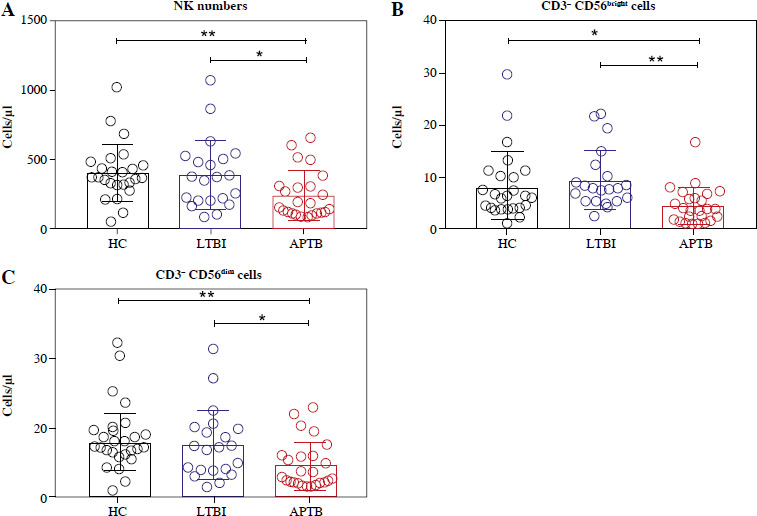 Here, therefore, the numbers and immunophenotypes of circulating NK cells and their two subpopulations in LTBI patients were described and compared with HCs and APTB patients. Our results provide a new basis for clinical formulation of immunization interventions.