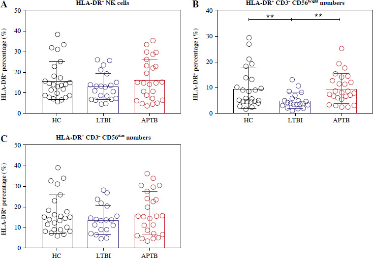 The frequencies of HLA-DR+ NK cells in LTBI patients did not differ significantly compared with HCs and APTB patients (Fig. 2A). However, further examination showed that the frequency of HLA-DR+ CD56bright NK cells in LTBI patients was significantly lower than that in HCs and APTB patients (Fig. 2B).