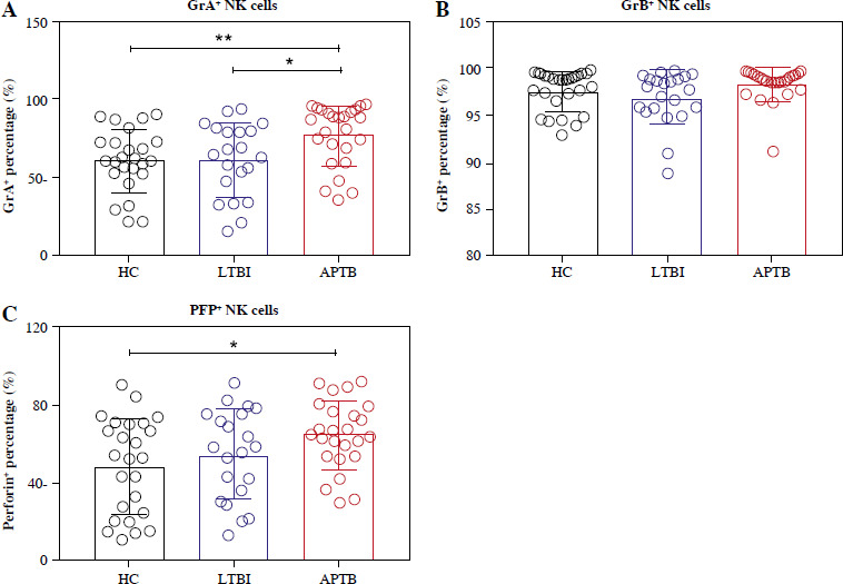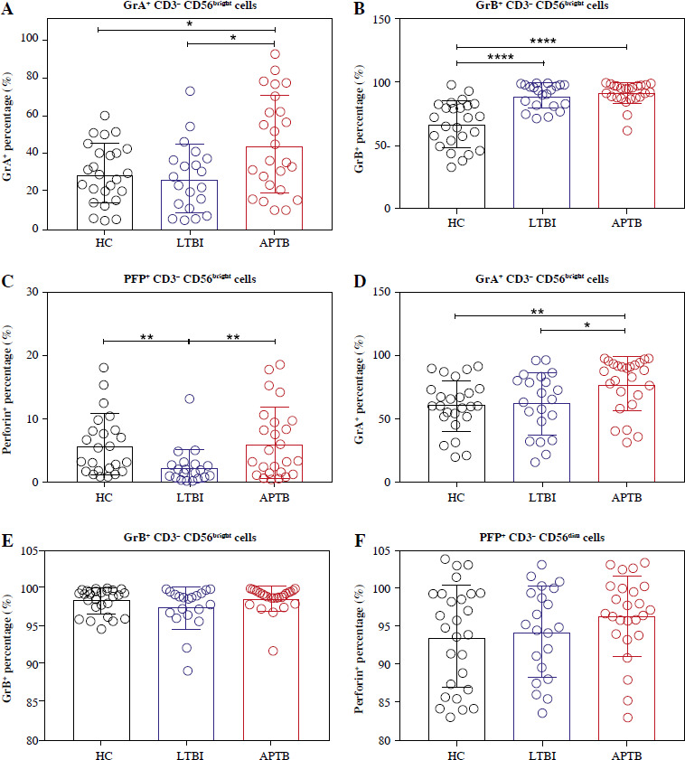 Detection of expressed toxic particles revealed that the expression of GrA in NK cells of LTBI patients was not as high as in APTB patients (Fig. 3A), and the expression of GrB and PFP was not significantly different (Fig. 3B, C). Further detection showed that, compared with HCs, the intracellular GrB levels in CD56bright NK cells were as significantly elevated in LTBI patients as in APTB patients (Fig. 4B), while their intracellular GrA and PFP levels were both significantly lower than in APTB patients (Fig. 4A, C).