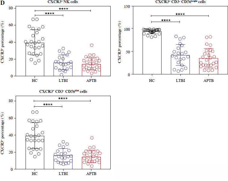 Compared with HCS, the frequencies of CXCR3+ NK cells, CXCR3+ CD56bright NK and CXCR3+ CD56dim NK cells were greatly reduced in both LTBI and APTB patients (Fig. 5).