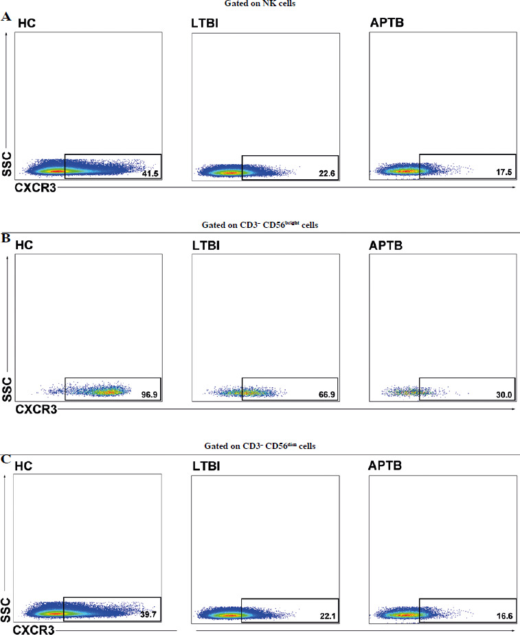 Compared with HCS, the frequencies of CXCR3+ NK cells, CXCR3+ CD56bright NK and CXCR3+ CD56dim NK cells were greatly reduced in both LTBI and APTB patients (Fig. 5).