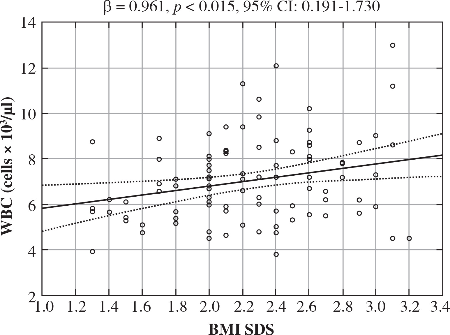 The differences derived from the comparison between variables were confirmed by the backward stepwise regression analysis. Six models were proposed in order to evaluate the relationship between the baseline WBC count (models 1 and 2), the baseline neutrophil count (models 3 and 4) and the baseline monocyte count (models 5 and 6), which were considered as dependent variables and selected independent variables (models 1, 3 and 5: BMI SDS, % BFM, WC and WHtR; models 2, 4, and 6: CRP and fasting insulin concentrations, HOMA-IR and TG/HDL ratio). The baseline BMI SDS and fasting insulin concentration were identified as independent predictors of both the baseline WBC count (model 1: β = 0.961, 95% CI: 0.191-1.730, R2 = 0.061, F = 6.15, p < 0.015, Fig. 1; model 2: β = 0.040, 95% CI: 0.011-0.067, R2 = 0.10, F = 7.93, p < 0.006) and the baseline neutrophil count (model 3: β = 1.04, 95% CI: 0.467-1.613, R2 = 0.121, F = 12.99, p < 0.01; model 4: β = 0.031, 95% CI: 0.009-0.053, R2 = 0.105, F = 8.34, p < 0.005). No correlation between the baseline monocyte count in models 5 and 6 was found.