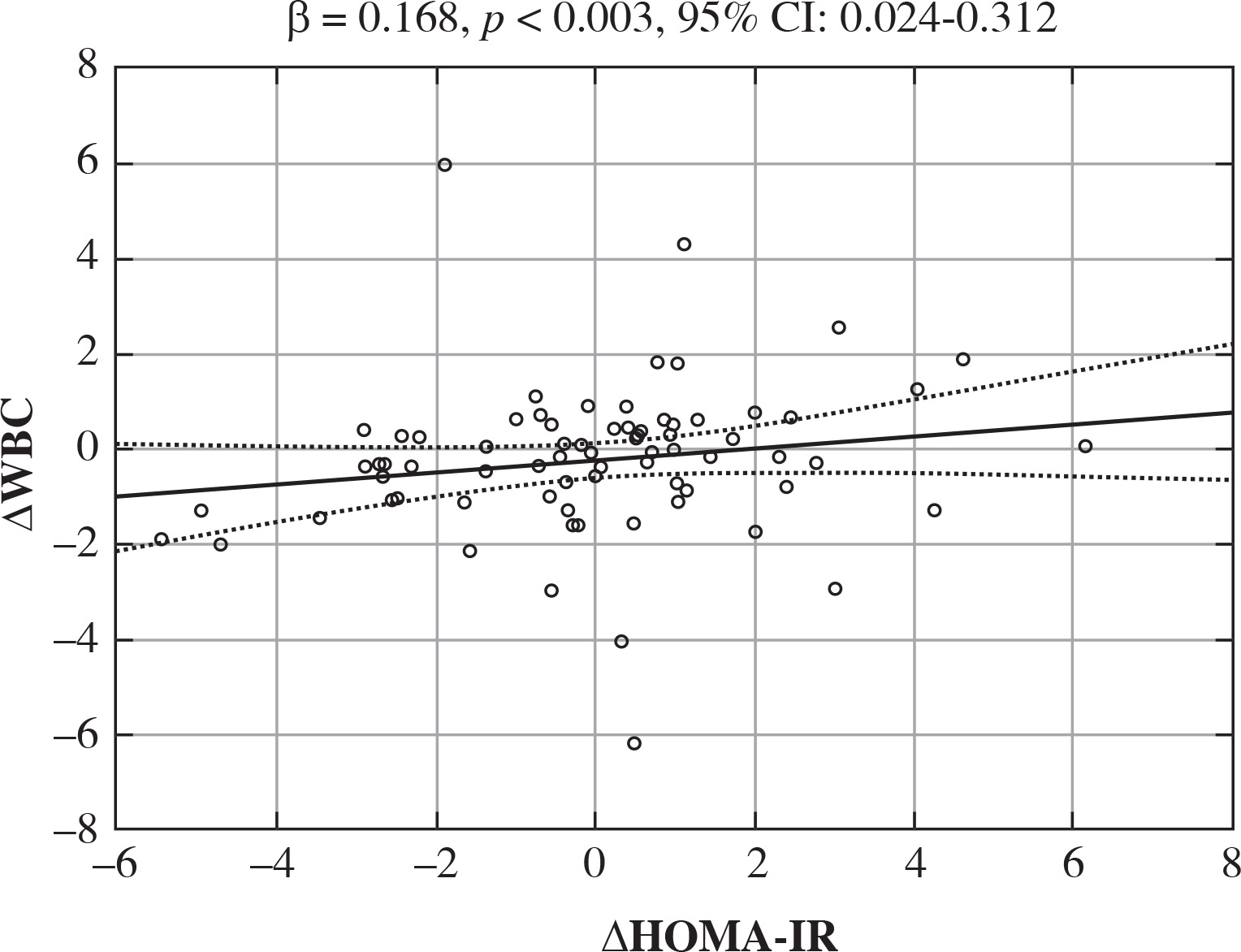 In order to evaluate independent relationships between ΔWBC count (model 7), ∆neutrophil count (model 8) and Δmonocyte count (model 9), which were considered as dependent variables, and changes in selected anthropometric and biochemical parameters during 6-12 months of the observation period, which were considered as independent variables, backward stepwise regression models were used (model 7 including ∆BMI SDS, ∆insulin concentration, ∆HOMA-IR and ∆TG/HDL ratio; models 8 and 9 including ∆BMI SDS, ∆insulin concentration, ∆TG/HDL ratio and ∆CRP). In models 7 and 8, ∆HOMA-IR (β = 0.168, 95% CI: 0.024-0.312, R2 = 0.175, F = 6.26, p < 0.003, Fig. 2; β = 0.135, 95% CI: 0.023-0.246, R2 = 0.192, F = 7.03, p < 0.002, respectively) and ∆TG/HDL ratio (β = 0.305, 95% CI: 0.074-0.534, R2 = 0.175, F = 6.26, p < 0.003; β = 0.256, 95% CI: 0.077-0.434, R2 = 0.192, F = 7.03, p < 0.002) were identified as independent predictors of both ∆WBC count and ∆neutrophils. In model 9, ΔHOMA-IR had a significant impact on Δmonocyte count (β = 0.719, 95% CI: 0.079-1.360, R2 = 0.116, F = 1.87, p < 0.03).