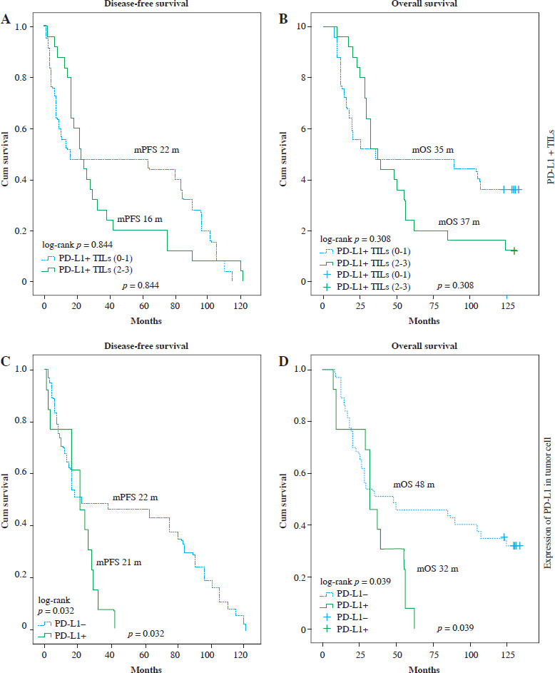 Kaplan-Meier survival analysis with log-rank test (Fig. 2) demonstrated that patients with low PD-L1+ TIL expression (scores 0-1) had median overall survival (OS) of 35 months compared to 37 months for those with high expression (scores 2-3). Median disease-free survival (DFS) was 16 months and 22 months for low and high PD-L1+ TIL expression groups, respectively. When comparing tumor cell PD-L1 status, PD-L1-negative patients showed longer median OS (48 months vs. 32 months) and slightly longer median DFS (22 months vs. 21 months) compared to PD-L1-positive patients. Overall survival rates were consistently higher in the PD-L1-negative group.