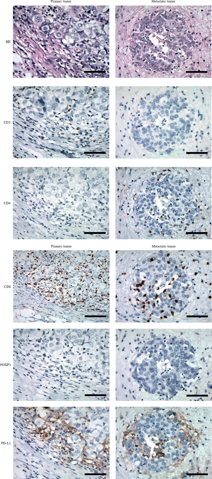 Statistical analyses were performed using SPSS version 20 (IBM, Armonk, NY, USA). Correlations between immunological features in primary tumors and matched metastatic lesions were assessed using the paired chi-square (χ2) test. Progression-free survival (PFS) and overall survival (OS) were evaluated using Kaplan-Meier analysis, with differences between survival curves compared using the log-rank test [26]. Statistical significance was set at p < 0.05.