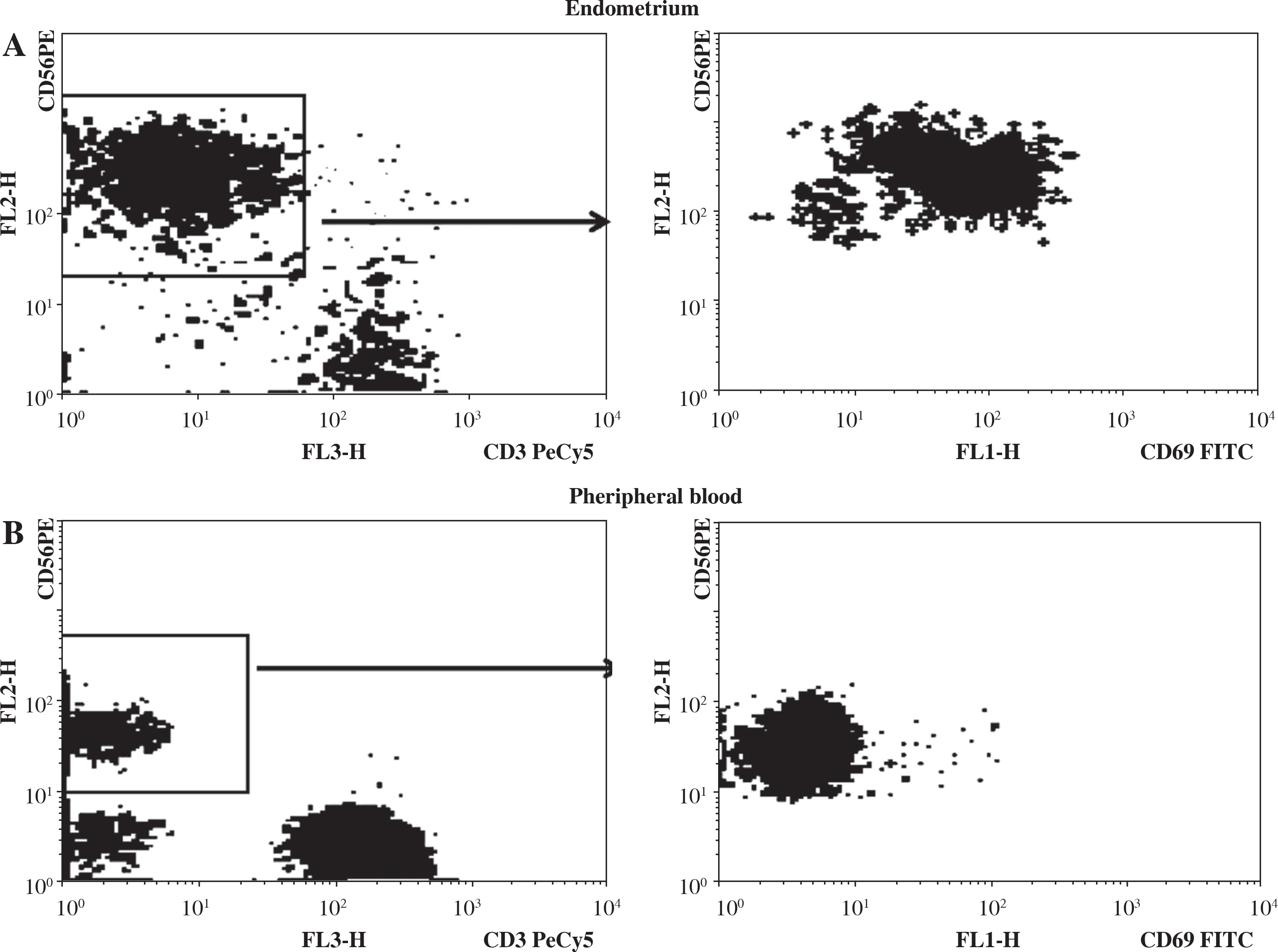 Differential CD56 (left) and CD69 (right) expression in endometrium (A) and peripheral blood (B) and lymphocytes