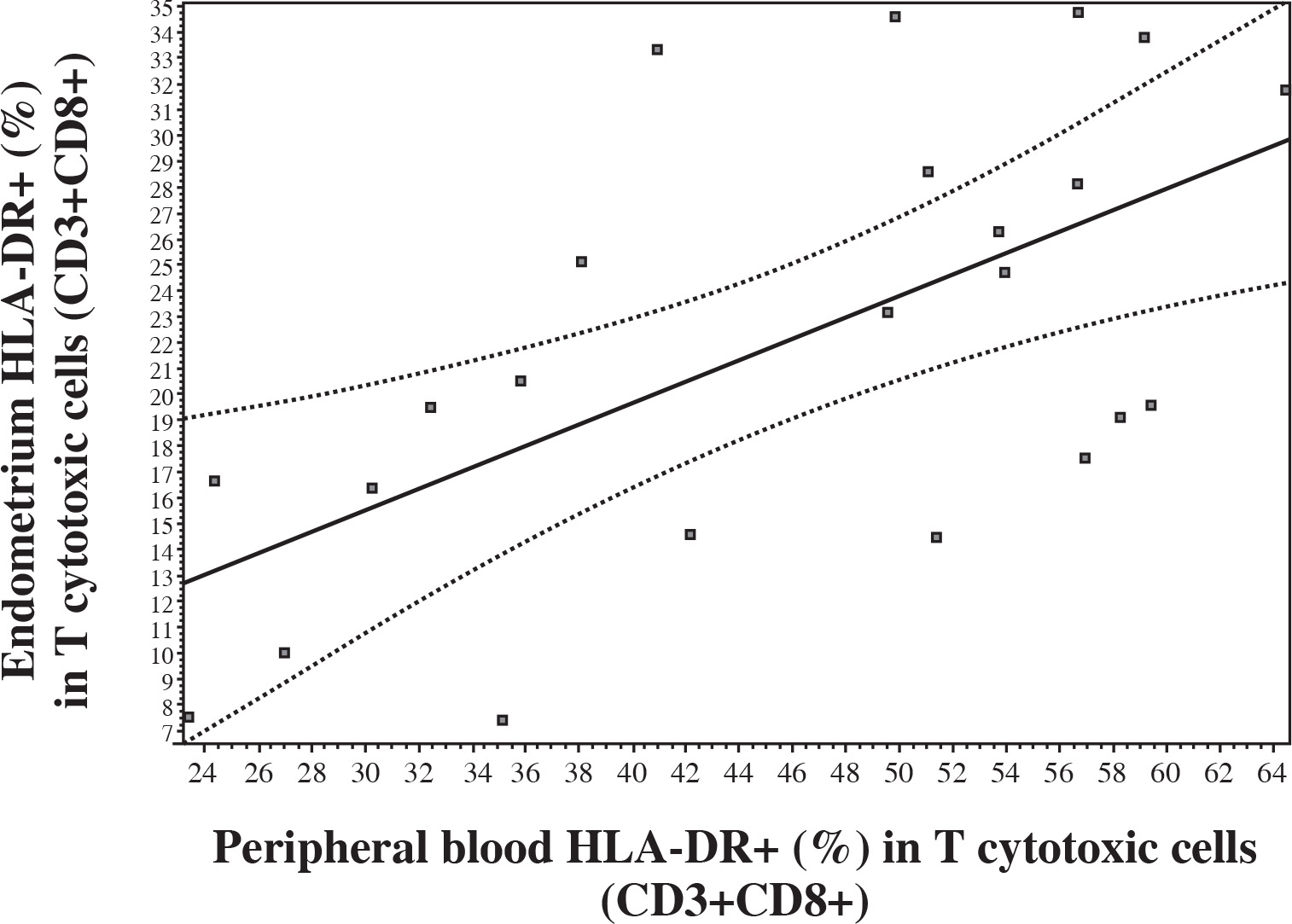 Correlation in the levels of HLA DR+ (%) in CD8+ T lymphocytes between peripheral blood and endometrium (Pearson correlation r = 0.6107, p < 0.01; 95% CI: 0.2651-0.8172; Spearman correlation rs = 0.5337, p < 0.01, 95% CI: 0.1430 to 0.7805)
