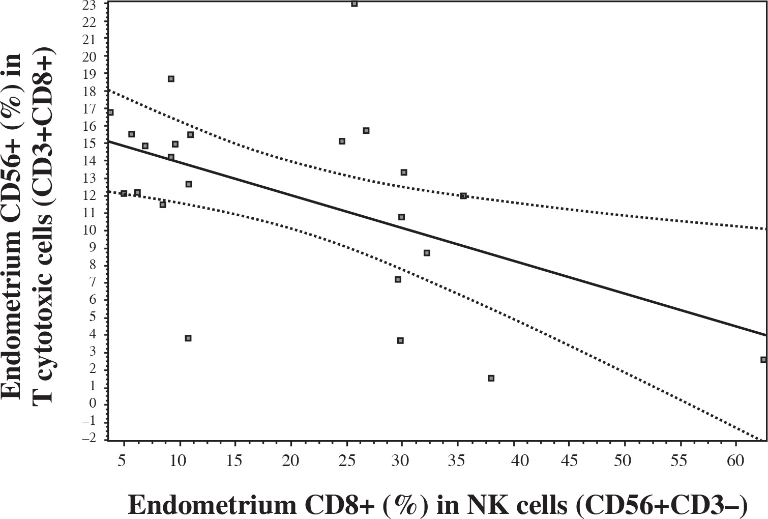It was interesting that endometrial CD56 expression in CD8+ T cells negatively correlated with endometrial CD8 expression in NK cells (Fig. 4). There was no such correlation in peripheral blood.