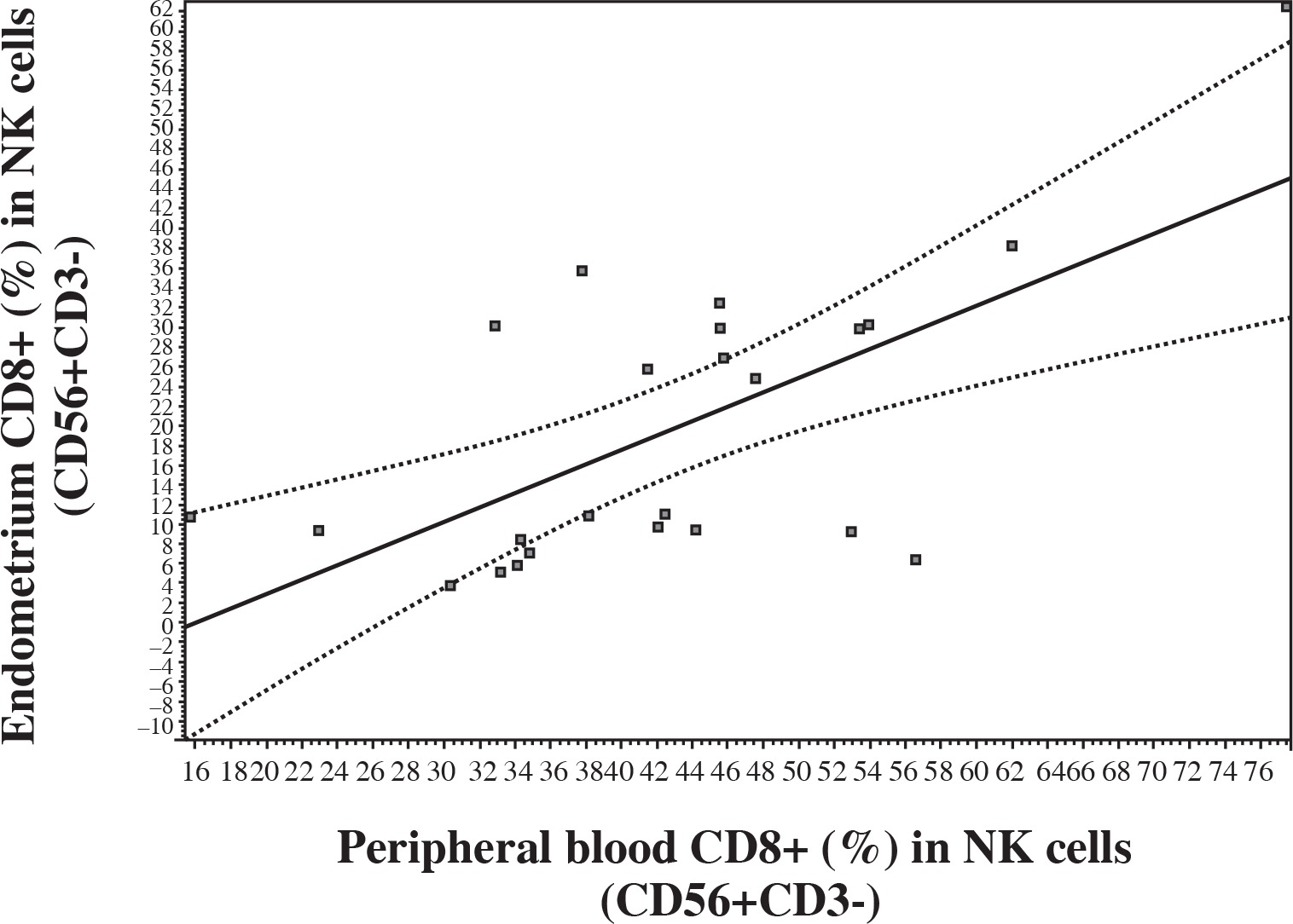 Correlation in the levels of CD8+ (%) in NK lymphocytes (CD56+CD3-) between peripheral blood and endometrium (Pearson correlation r = 0.6478, p < 0.001, 95% CI: 0.3307-0.8334; Spearman correlation rs = 0.498, p < 0.01, 95% CI: 0.1058 to 0.7561)