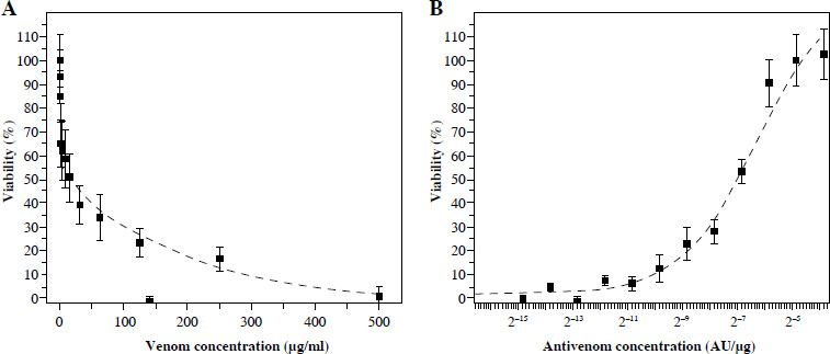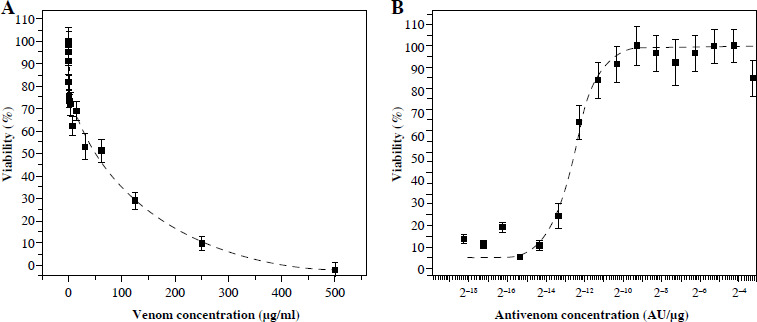MTT activity of Vero cells after incubation with different quantities of V. ammodytes venom (A) and mixtures of one IC50 venom (determined by MTT assay) and different two-fold dilutions of V. ammodytes antivenom (B). Dashed lines represent the regression curve