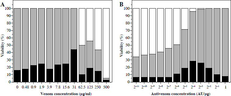 Vero cell viability counted in a hematocytometer after trypan blue staining. Cells incubated with different venom concentrations (A) and mixtures of one IC50 venom (determined by trypan blue staining) and different two-fold dilutions of V. ammodytes antivenom (B). White part of column – disintegrated cells; black part of column – dead cells; grey part of column – viable cells