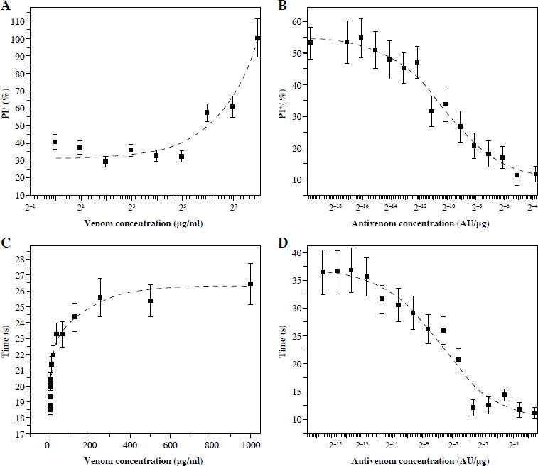 Percentage of PI+ Vero cells in suspension determined by flow cytometry (A and B) and time required for FACSVerse to count 10 000 cells (C and D) after incubation with venom (A and C) and mixtures of one IC50 venom (B and D, determined by propidium iodide staining and flow cytometry analysis) and different two-fold dilutions of V. ammodytes antivenom. Dashed lines represent the regression curve