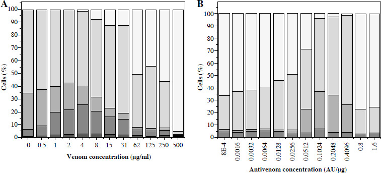 Percentage of annexin V/PI Vero cells determined by flow cytometry in suspension after incubation with different quantities of V. ammodytes venom (A) and mixtures of one IC50 venom (determined by MTT method) and different two-fold dilutions of V. ammodytes antivenom (B). White part of column – disintegrated cells; light gray part of column – viable cells (annexin V–/PI–); middle gray part of column – cells in early apoptosis (annexin V+/PI–); dark gray part of column – cells in late apoptosis or necrosis (Annexin V+/PI+); black part of column – necrotic cells (Annexin V–/PI+)