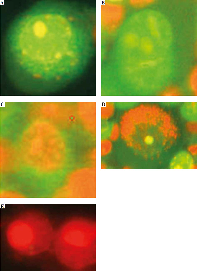 It was previously found [32] that annexin V+PI+ can be a phenotype of primary necrotic as well as late apoptosis cells. Because the appearance of annexin V+PI– cells is directly followed by the appearance of annexin V+PI+ phenotype cells (Fig. 5A), we concluded that these are cells in the phase of late apoptosis. After increasing the venom concentration to more than 4 µg/ml, the presence of early, late apoptotic, and viable cells decreased significantly due to the strong activity of venom enzymes directed towards cell membrane disintegration, and annexin V+PI+ cells were detected only sporadically (Fig. 5). At concentrations higher than 30 µg/ml, cell necrosis dominated. We used the AO/EB staining method to detect live, early and late apoptotic, dead and necrotic cells [33].