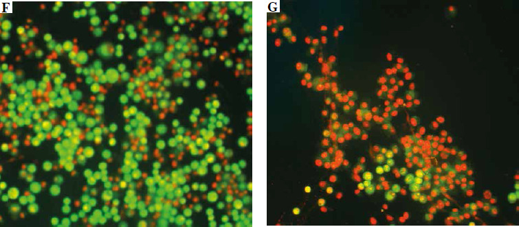 In addition to detecting live (green nucleus and cytoplasm, Fig. 6A, F), early and late apoptotic (Fig. 6B, C), and dead cells (red nucleus and cytoplasm, Fig. 6E, G) by AO/EB staining, we also observed cells with green nucleus and red cytoplasm (Fig. 6D). Cells are stained in this way because venom enzymes disrupt the integrity of the cell membrane but not the nuclear membrane. This allows both colors to enter the cytoplasm, which then turns red, while only AO passes through the intact membrane of the nucleus and turns it green. We considered these cells to be early necrotic because there was no characteristic apoptotic condensation of nucleus chromatin.