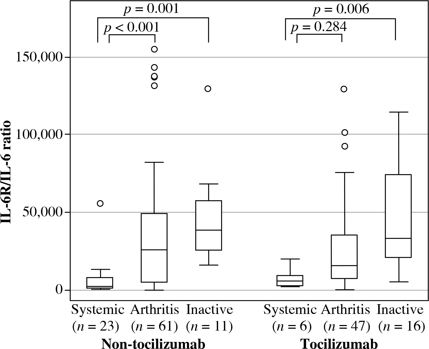 TCZ treatment had no effect on the group order based on absolute serum IL-6 levels. Thus, for patients treated with or without TCZ, the highest levels were seen in the systemic group, followed by the arthritis and inactive group (Table 2). However, within the arthritis subgroup, serum IL-6 levels were significantly higher in patients treated with than in those treated without TCZ (median [IQR] 57.3 [119.9] vs. 3.9 [22.4] pg/ml; p < 0.001), whereas no TCZ-related differences were seen between patients within the systemic or inactive groups (Table 2).