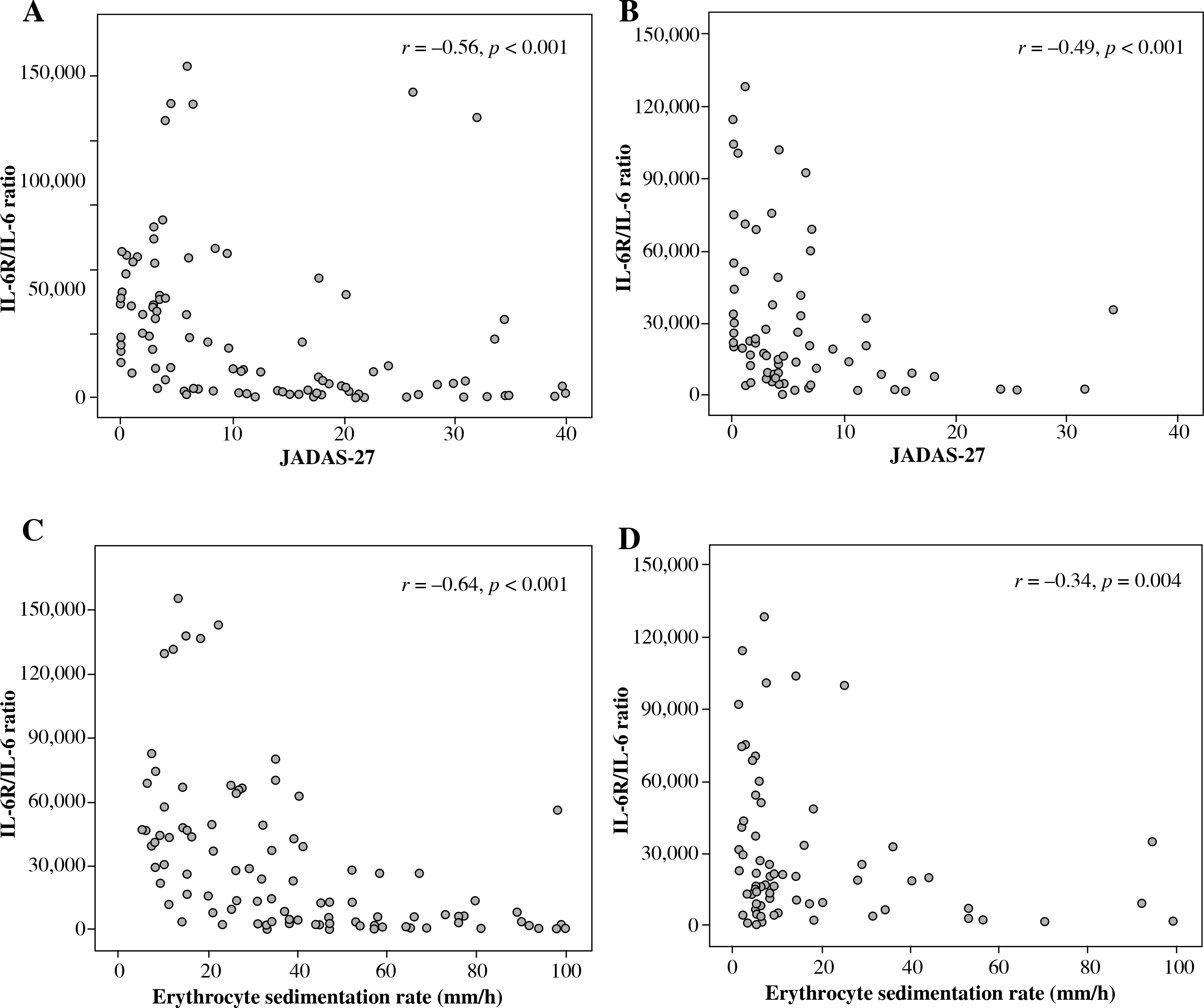 Correlations between the sIL-6R/IL-6 ratio with Juvenile Arthritis Disease Activity Score-27 (JADAS-27) and erythrocyte sedimentation rate (ESR) in systemic juvenile idiopathic arthritis (SJIA) patients treated with and without tocilizumab (TCZ). Correlations between sIL-6R/IL-6 ratio with JADAS-27 in SJIA patients treated (A) without TCZ (95 samples) and (B) with TCZ (69 samples). Correlations between sIL-6R/IL-6 ratio with ESR in SJIA patients treated (C) without TCZ (95 samples) and (D) with TCZ (69 samples)