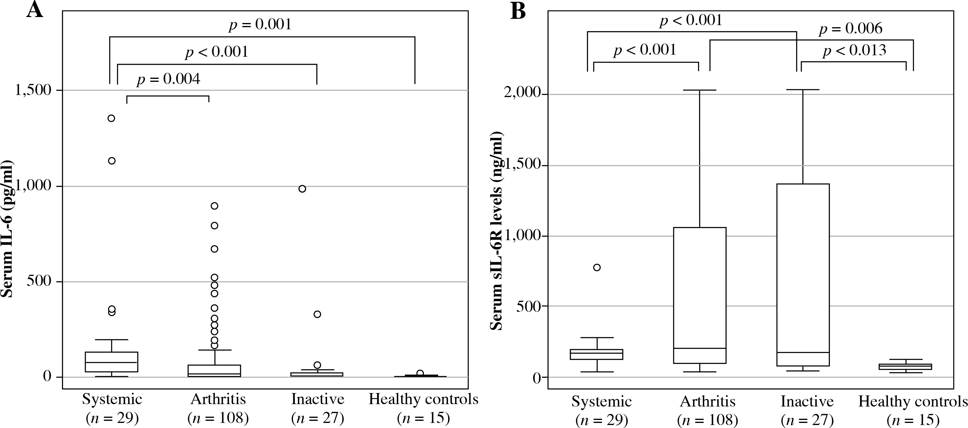 Serum IL-6 and sIL-6R levels in systemic juvenile idiopathic arthritis patients. Patient serum samples were classified by disease status and analyzed for (A) serum IL-6 levels or (B) serum sIL-6R levels. Data are the median, interquartile range, and minimum/maximum values of the indicated number of samples for each subgroup
