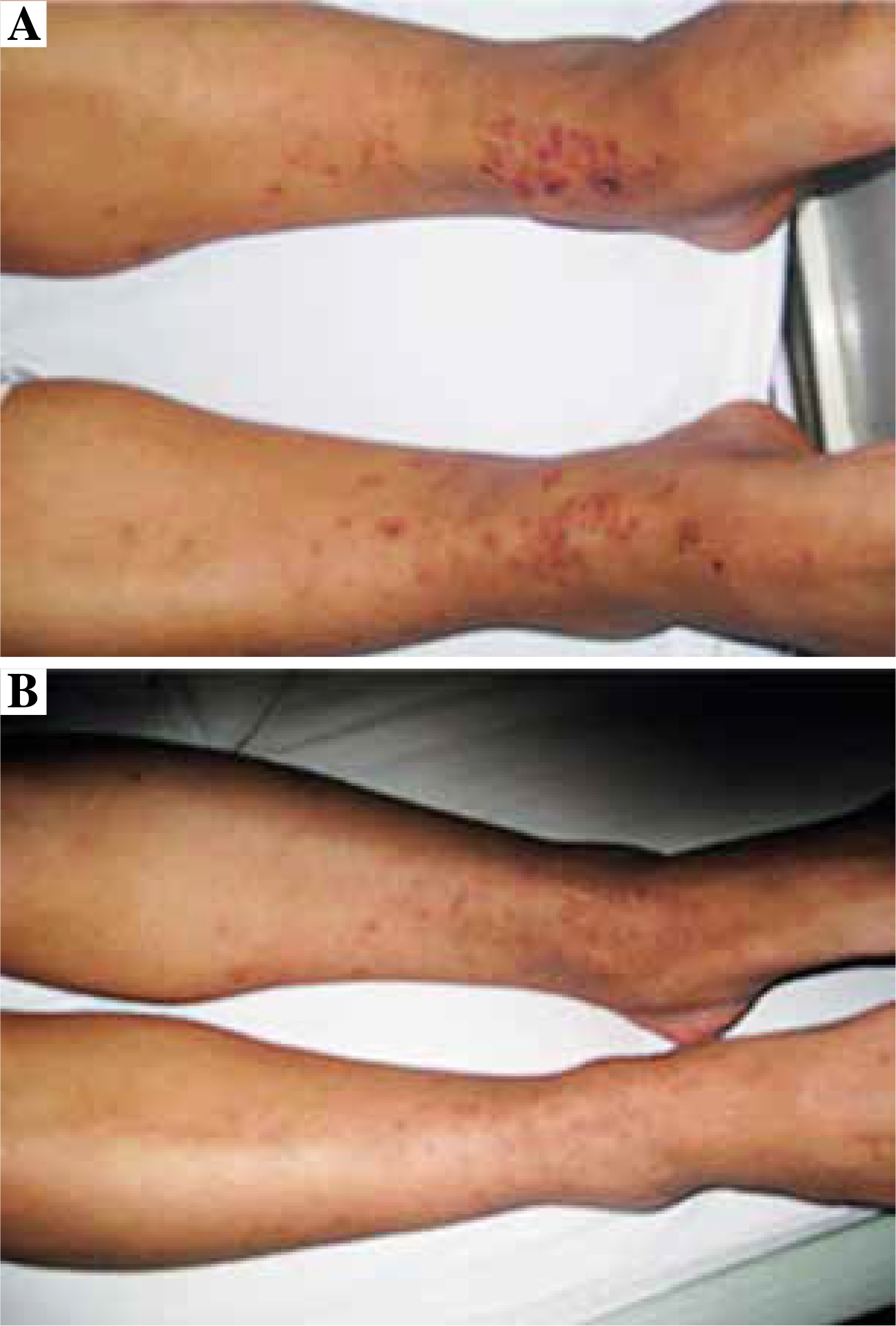 Purpuric lesions with different sizes were found in these patients. The distribution mainly involved dependent areas such as the lower extremities (Fig. 1A). Initially the lesions were single and little, but later coalesced to form ecchymotic areas. After treatment, the purpura disappeared and the color darkened. These results indicated a significant recovery for skin lesions after treatment (Fig. 1B).