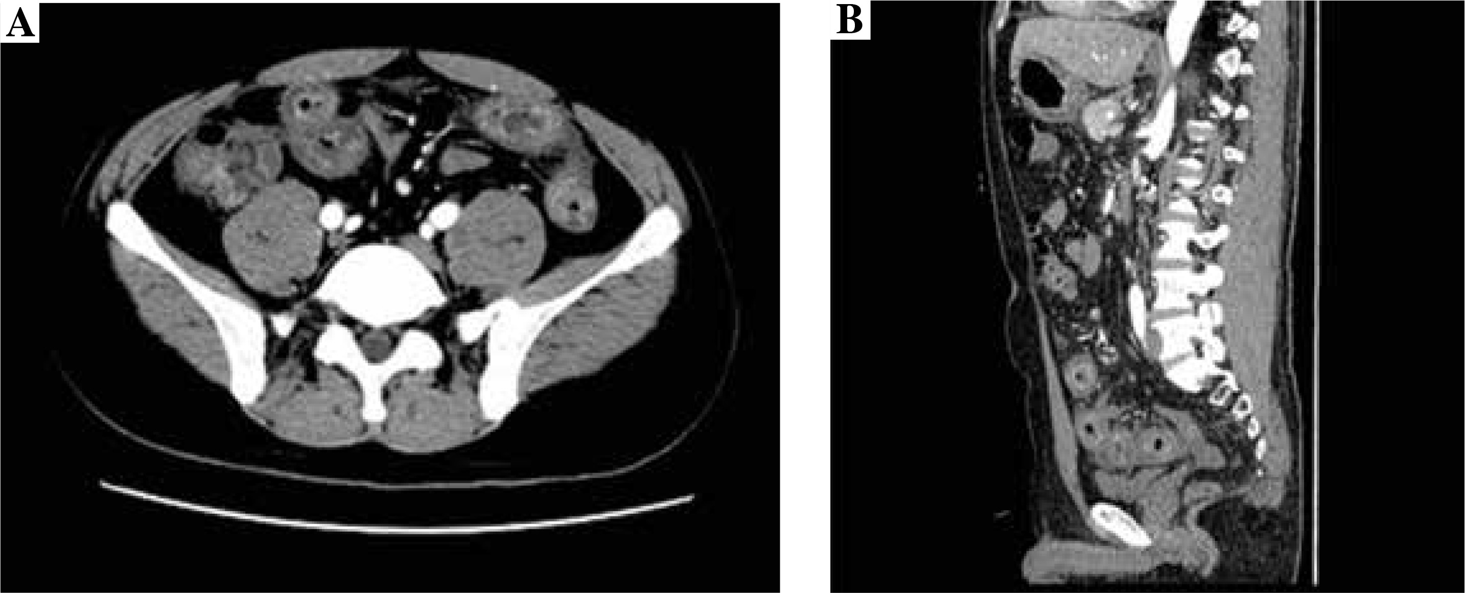 The contrast-enhanced CT examination of the abdomen showed the intestinal canal wall thickening and edema (Fig. 2).