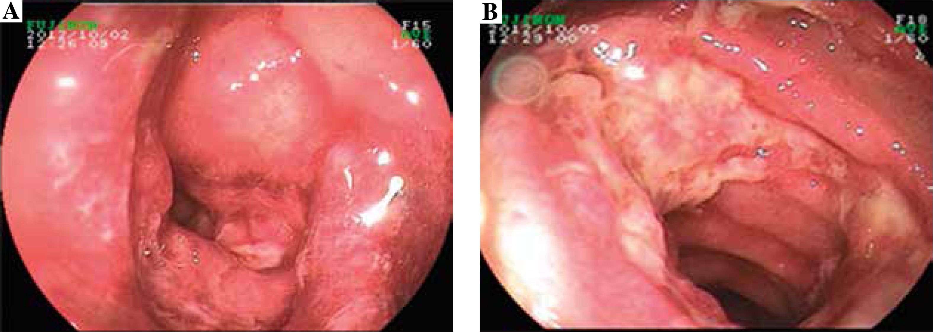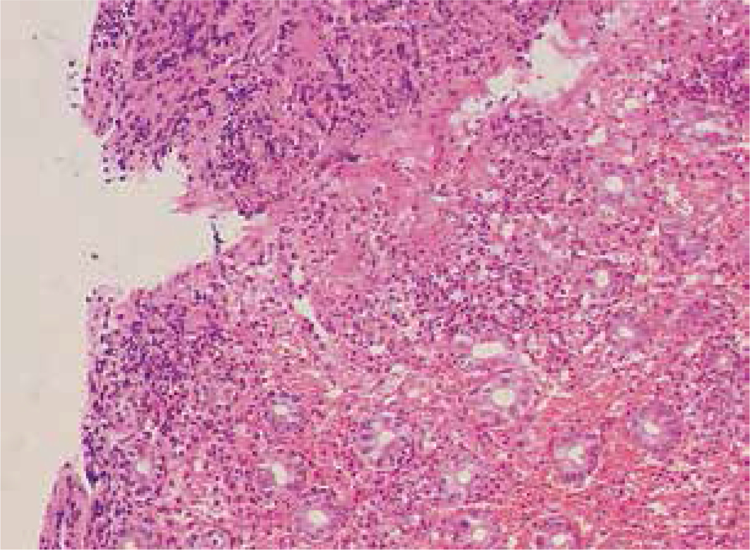 Endoscopic examination demonstrated diffused hyperemia, dropsy and erosion in the inferior segment of the ileum (Fig. 3A). And a ring-shaped ulcer was also seen in the small intestine (Fig. 3B). Pathologic examination revealed extravasation of red blood cells with mild inflammation. In addition, the examination clearly delineated a great quantity of neutrophilic leukocyte infiltration in mucosa and sub-mucosa, and obvious bleeding points in mucosa (Fig. 4).