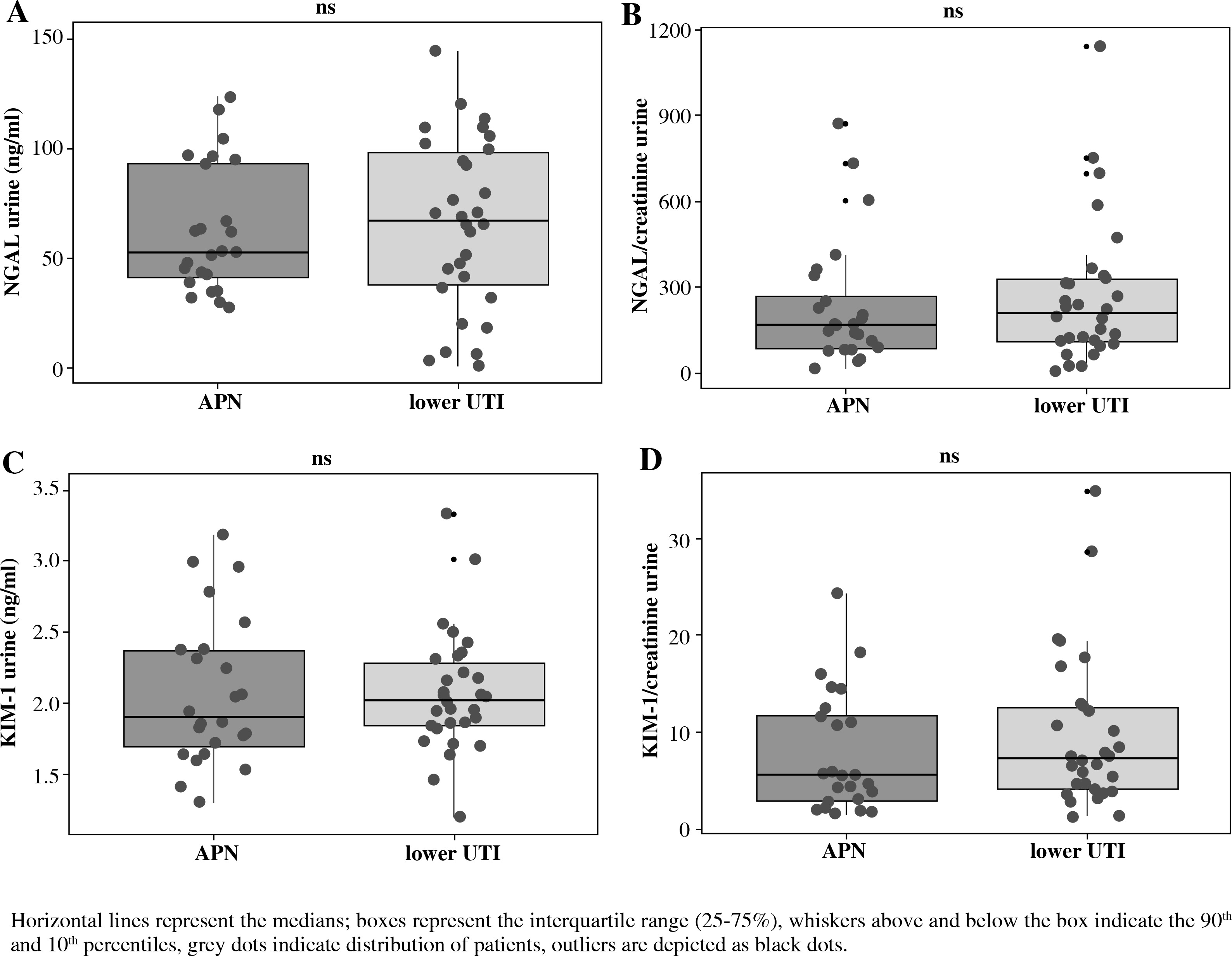 Based on the results of our study we did not find any significant differences in levels of uNGAL and uKIM-1 in children aged 1-24 months with APN and lower UTI. We determined both normalized and non-normalized values of uNGAL and uKIM-1, but normalization did not improve the results of this research. ROC analysis has demonstrated good diagnostic profiles only for PCT and CRP for predicting APN.