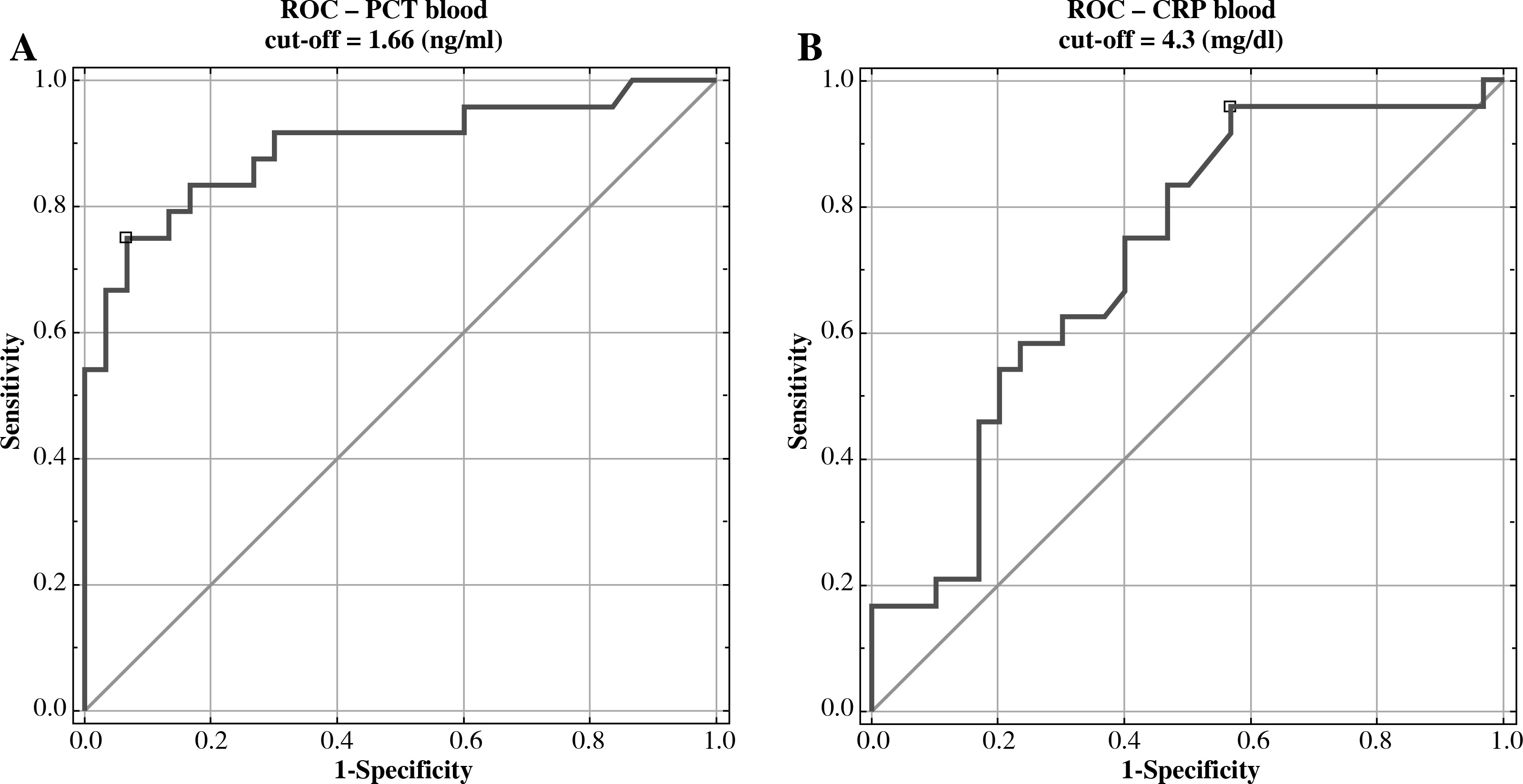Statistical analysis was performed using commercial Statistica package vs. 11.0 for Windows (StatSoft; Tulsa, OK). The distribution of continuous variables was tested for normality. Continuous data were presented as the mean ±standard deviation (SD) or median with corresponding 25th and 75th percentiles (IQR). Categorical data were presented as numbers and percentiles. Statistical analysis of differences between two groups with normal distribution was determined by parametric Student’s t-test. Non-parametric Mann-Whitney U test was used for the variables that were not distributed normally. To compare categorical variables between two groups, the χ2 test was used. Correlations between variables were evaluated by linear regression analysis or Spearman’s rank correlation. Univariate and multivariate logistic regression analysis was performed including 95% confidence interval (CI) to identify clinical variables associated with the presence of APN and to find an independent predictor of APN. Receiver operating characteristic (ROC) analysis was employed to calculate the area under the curve (AUC) to determine the best cut-off values, sensitivity and specificity for clinical variables to predict APN. The results were evaluated within 95% CI. p values less than 0.05 were considered statistically significant for all tests.