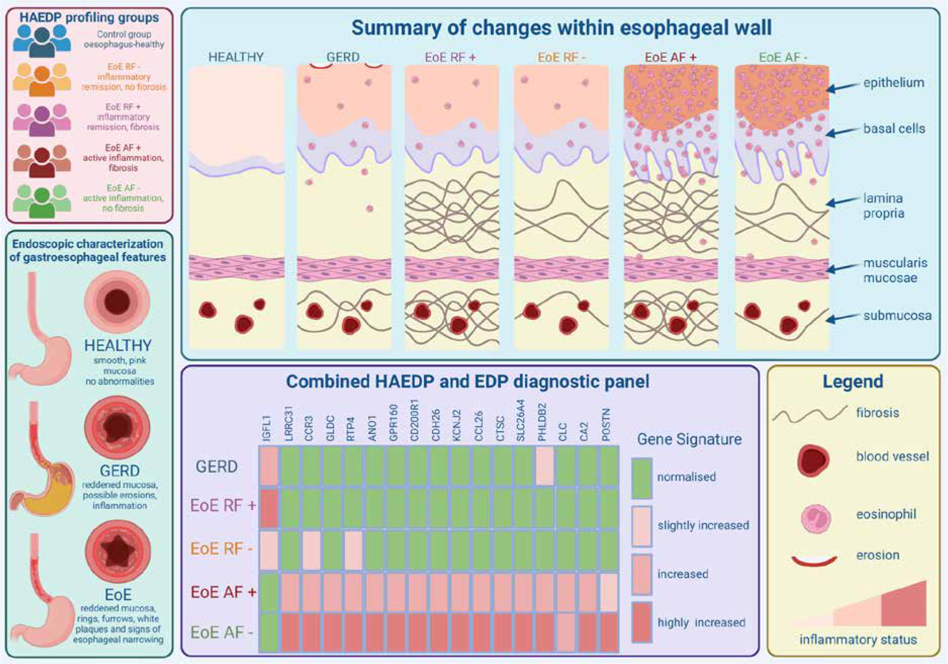 Graphical summary of differential diagnosis approaches in eosinophilic oesophagitis (EoE) variants from gastroesophageal reflux disease (GERD) and other EoE-like diseases. Combining a Histologically Active EoE Diagnostic Panel (HAEDP) with an EoE Diagnostic Panel (EDP) as a novel diagnostic tool may make it possible to distinguish patients with an active form of EoE from remission regardless of the fibrosis status. Heatmap represents the genes differentially regulated among investigated groups, namely GERD, EoE RF– (inflammatory remission, no fibrosis), EoE RF+ (inflammatory remission, fibrosis), EoE AF+ (active inflammation, fibrosis), EoE AF– (active inflammation, no fibrosis)