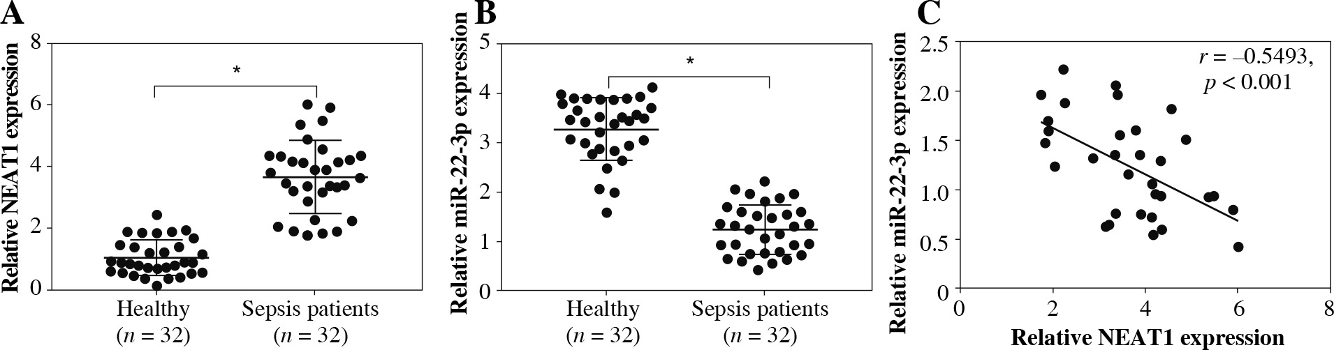 Expression of NEAT1 and miR-22-3p in sepsis patients. Relative NEAT1 (A) and miR-22-3p (B) expression levels in the serum of sepsis patients and healthy volunteers were examined by qRT-PCR. C) Pearson correlation analysis was used to analyze the correlation between NEAT1 and miR-22-3p. *p < 0.05