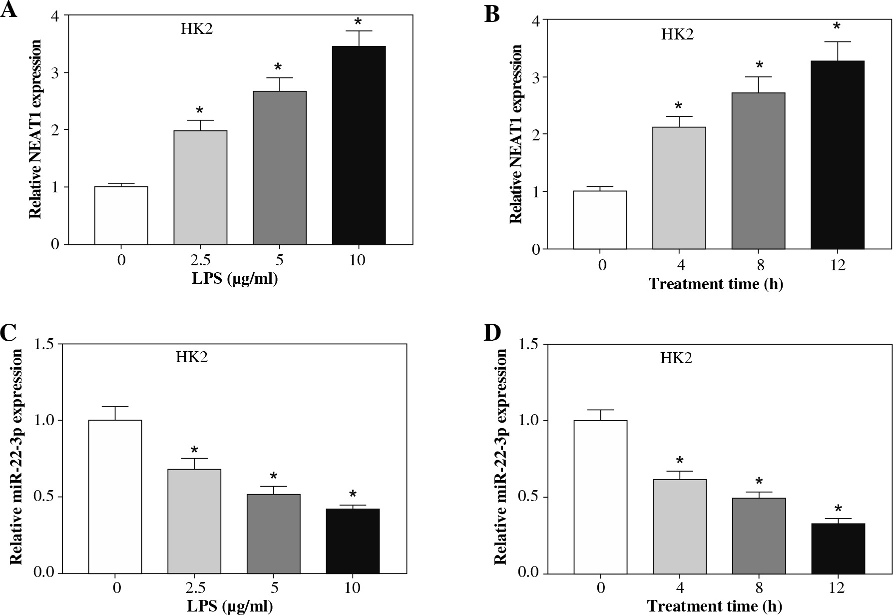 In the LPS-treated HK2 cell model, we found that the expression of NEAT1 was significantly increased in a dose-dependent and time-dependent manner (Fig. 2A, B), while the expression of miR-22-3p was remarkably decreased in a dose-dependent manner and time-dependent manner (Fig. 2C, D).