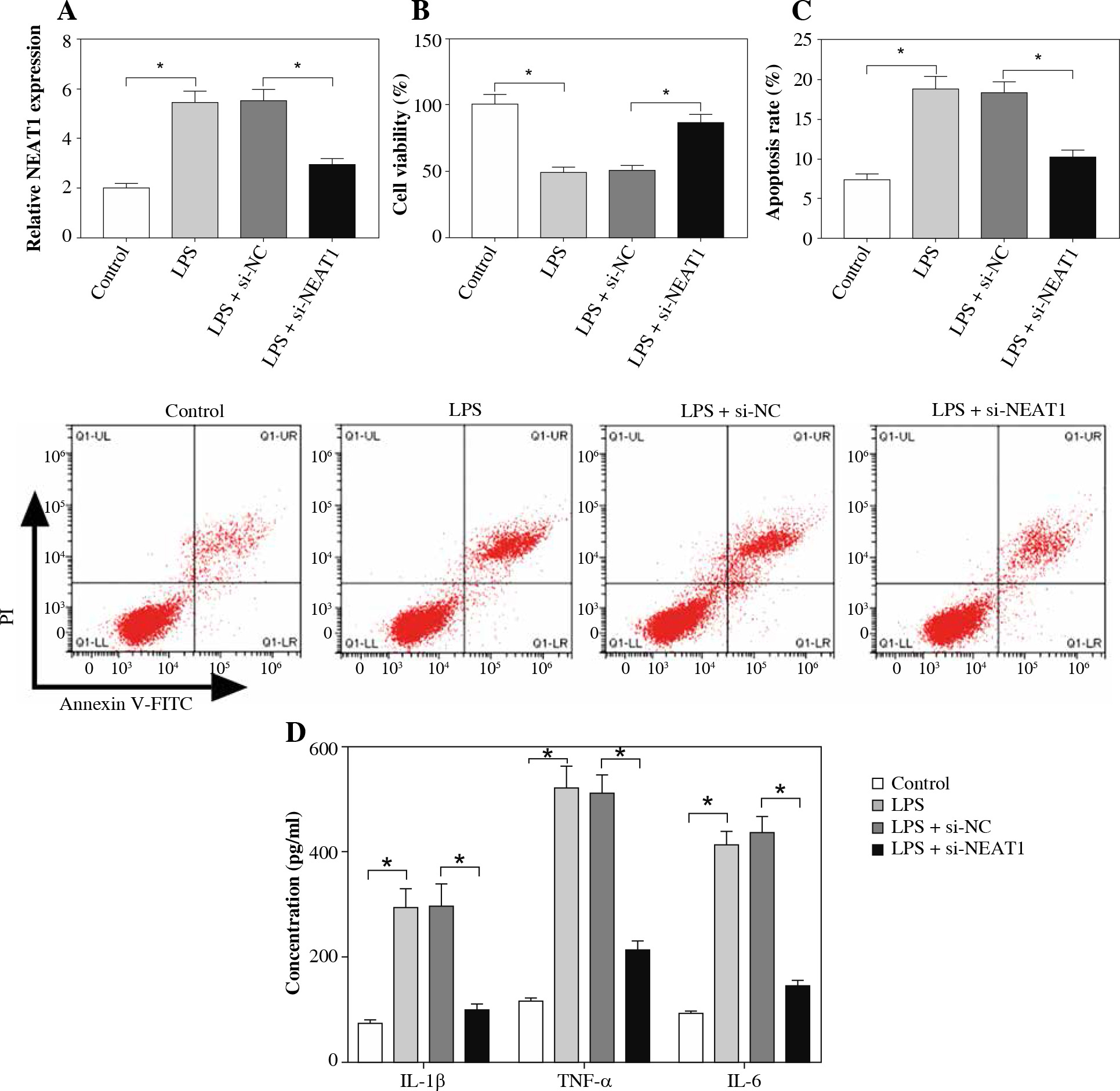 Effect of NEAT1 silencing on LPS-induced HK2 cell injury. HK2 cells were transfected with si-NC or si-NEAT1, and then treated with 10 μg/ml LPS for 12 h. A) Relative NEAT1 expression was detected by qRT-PCR to assess the transfection efficiency. Cell viability and apoptosis rate were determined using CCK8 assay (B) and flow cytometry (C). D) ELISA assay was used to test the concentrations of IL-1β, TNF-α and IL-6. *p < 0.05