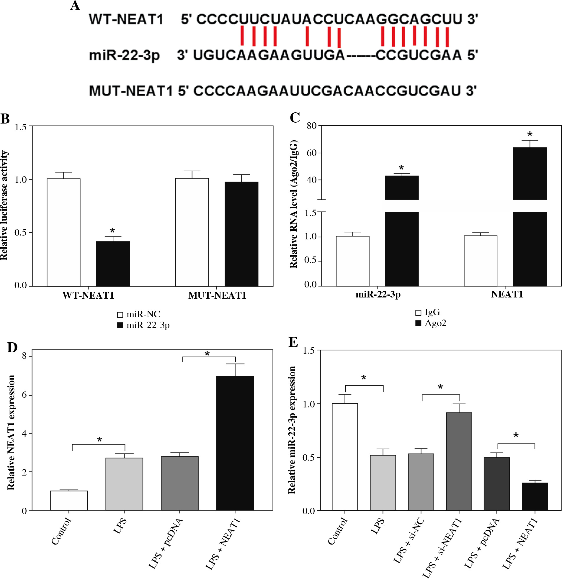 NEAT1 sponged miR-22-3p. A) The sequences of WT-NEAT1 and MUT-NEAT1 are shown. The interaction between miR-22-3p and NEAT1 was confirmed using dual-luciferase reporter assay (B) and RIP assay (C). D) Expression of NEAT1 was measured by qRT-PCR to verify the transfection efficiency of pcDNA NEAT1 overexpression vector. E) Relative miR-22-3p expression was detected by qRT-PCR in LPS-induced HK2 cells transfected with si-NC, si-NEAT1, pcDNA or NEAT1. *p < 0.05