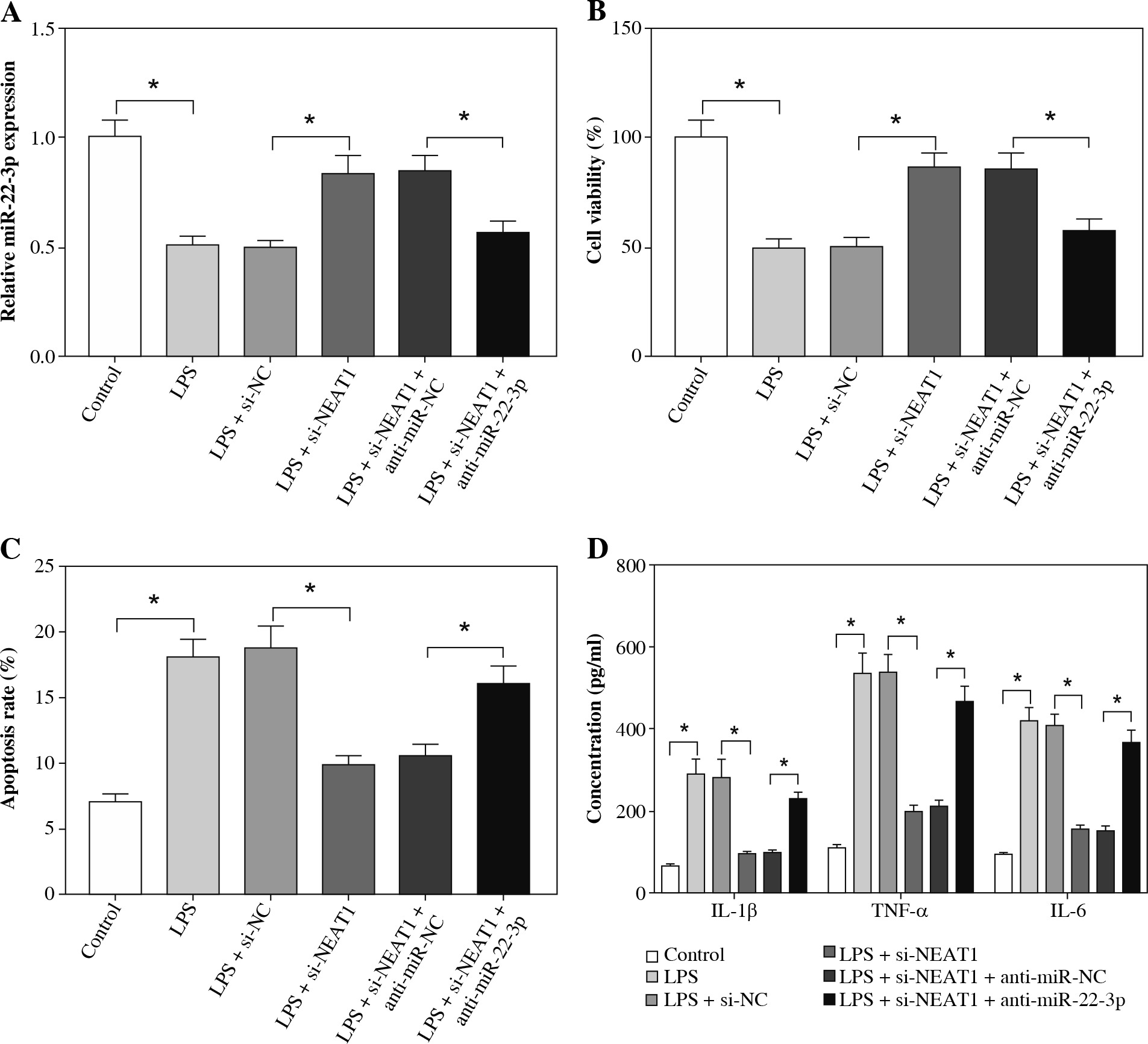 Further experiments were used to explore whether NEAT1 regulated LPS-induced kidney cell injury by regulating miR-22-3p. Through measuring the expression of miR-22-3p in LPS-induced HK2 cells, we confirmed that the transfection of si-NEAT1 and anti-miR-22-3p was successful (Fig. 5A). As shown in Figure 5B-D, we discovered that miR-22-3p inhibitor could reverse the promotion effect of NEAT1 silencing on viability and the suppressive effect of it on apoptosis rate and the concentrations of inflammatory cytokines in LPS-induced HK2 cells. All data suggested that NEAT1 negatively regulated miR-22-3p expression to mediate LPS-induced HK2 cell injury.