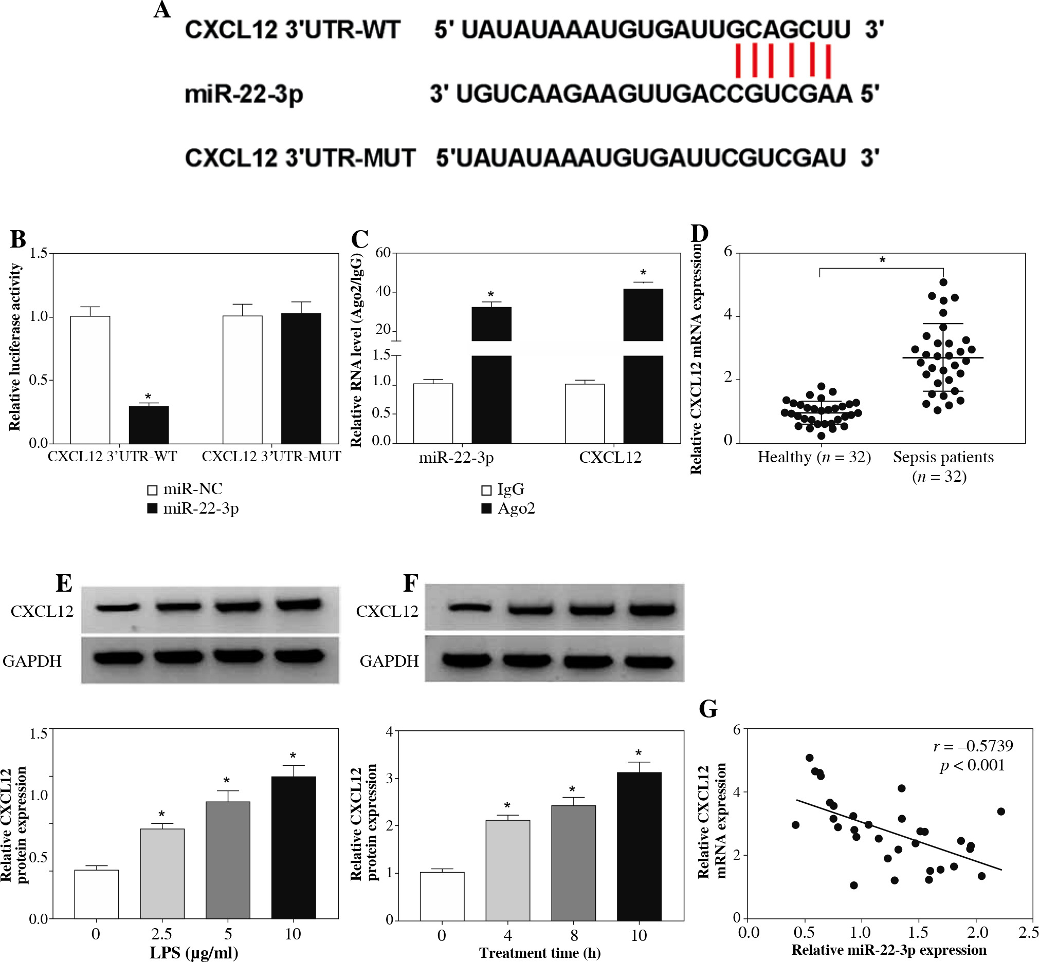 CXCL12 was a target of miR-22-3p. A) The fragments of CXCL12 3’UTR-WT and CXCL12 3’UTR-MUT are exhibited. Dual-luciferase reporter assay (B) and RIP assay (C) were used to confirm the interaction between miR-22-3p and CXCL12. D) Relative CXCL12 mRNA expression in the serum of sepsis patients and healthy volunteers was assessed by qRT-PCR. E) After treatment with different concentrations (0, 2.5, 5, and 10 μg/ml) of LPS for 12 h, the CXCL12 protein expression in HK2 cells was examined by Western blot (WB) analysis. F) After treatment with 10 μg/ml LPS for different times (0, 4, 8, and 12 h), the CXCL12 protein expression in HK2 cells was detected by WB analysis. G) The correlation between CXCL12 and miR-22-3p was evaluated using Pearson correlation analysis. *p < 0.05