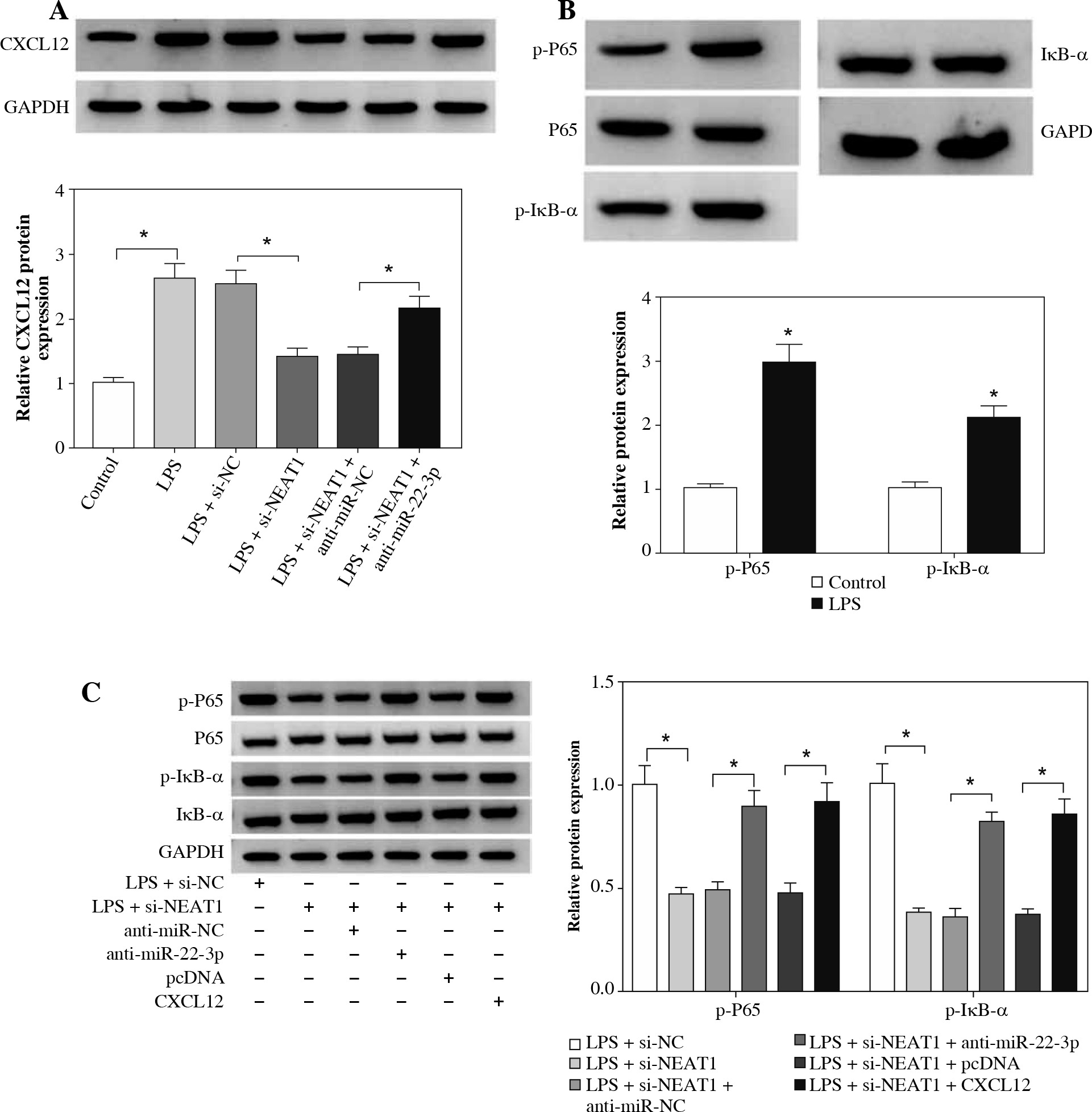 The NEAT1/miR-22-3p/CXCL12 axis regulated activity of the NF-κB signaling pathway. A) Protein expression of CXCL12 was measured by Western blot (WB) analysis in LPS-induced HK2 cells transfected with si-NC, si-NEAT1, si-NEAT1 + anti-miR-NC or si-NEAT1 + anti-miR-22-3p. B) After treatment with 10 μg/ml LPS for 12 h, the protein expression levels of p-P65 and p-IκB-α in HK2 cells were detected by WB analysis. C) The protein expression levels of p-P65 and p-IκB-α were examined using WB analysis in LPS-induced HK2 cells transfected with si-NC, si-NEAT1, si-NEAT1 + anti-miR-NC, si-NEAT1 + anti-miR-22-3p, si-NEAT1 + pcDNA or si-NEAT1 + CXCL12. *p < 0.05