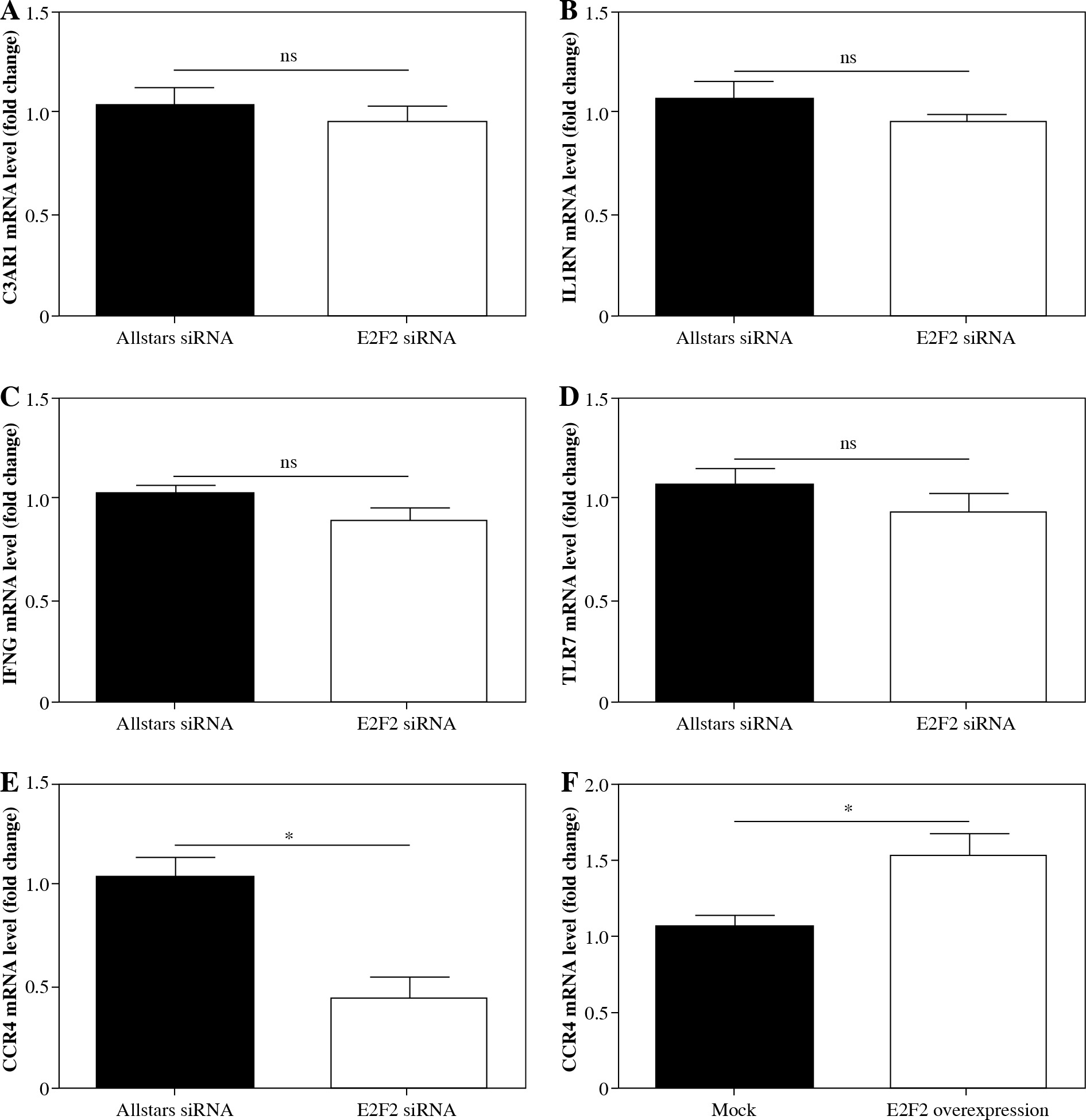 mRNA expression of the screened genes by PCR array analysis in RASF. A) C3AR1, B) IL1RN, C) IFNG, D) TLR7, E) CCR4 mRNA expression level in RASF with transfection of anti-E2F2 siRNA or Allstars siRNA. F) CCR4 mRNA expression level in RASF with transfection of E2F2-expressing plasmids or the blank plasmids (mock). *p < 0.05, ns – no statistical significance