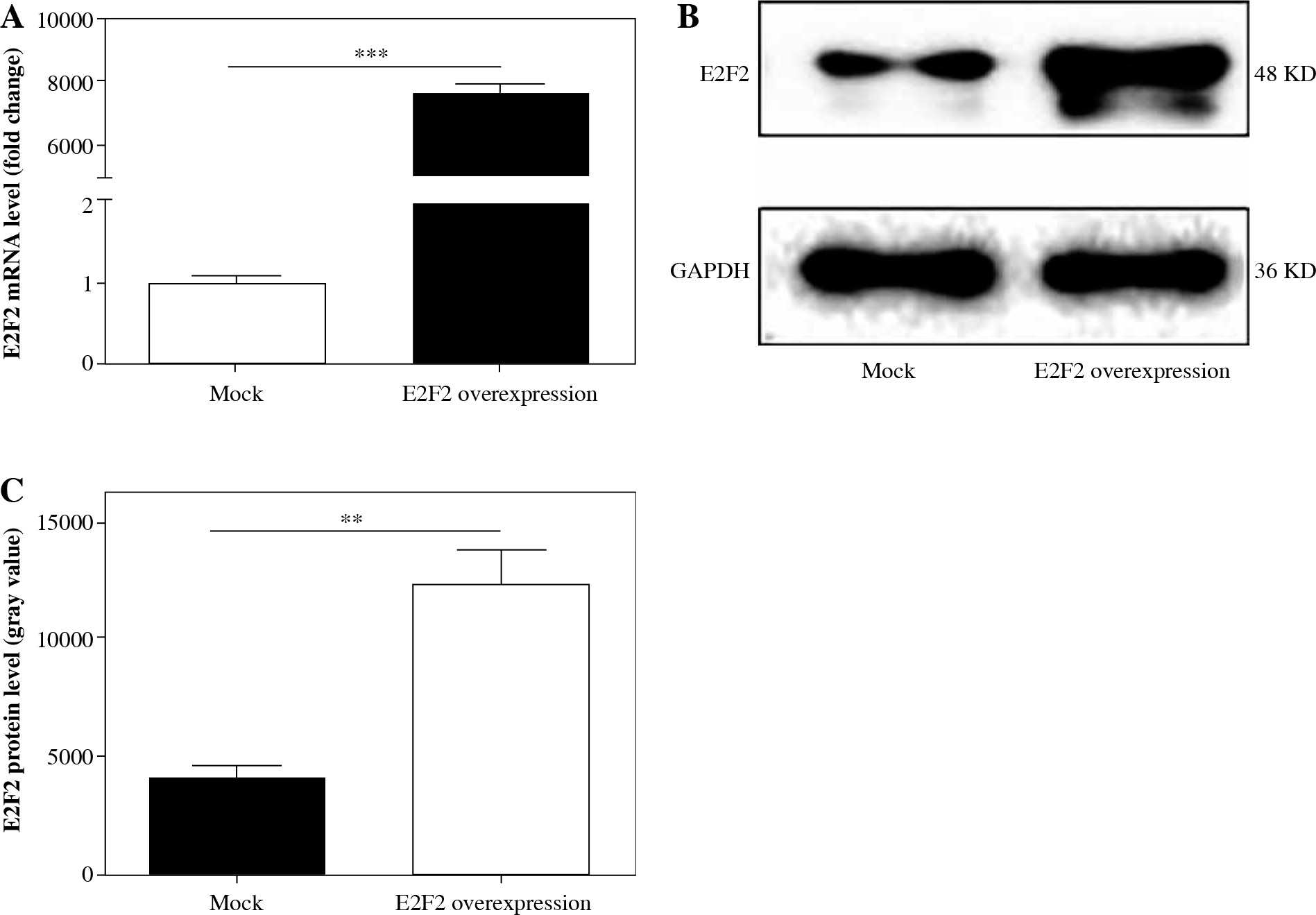 E2F2 expression level in RASF with transfection of E2F2-expressing plasmids or blank plasmids (mock). A) E2F2 mRNA expression level in RASF was detected using real-time PCR. B) E2F2 protein expression was detected in RASF using Western blot analysis. C) E2F2 protein expression was normalized to GAPDH expression. **p < 0.01, ***p < 0.001