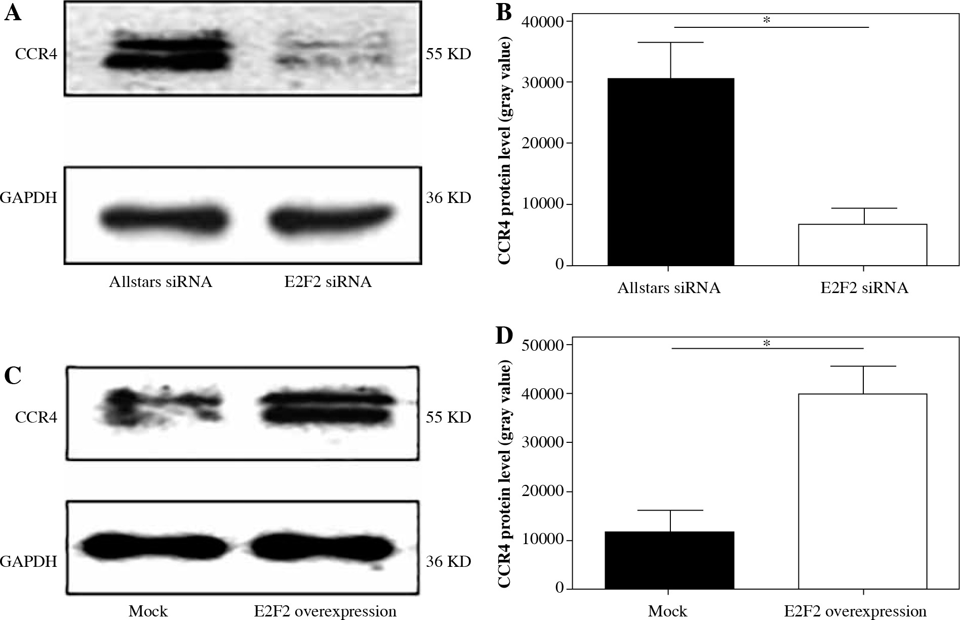 CCR4 protein expression in RASF using Western blot analysis. A) CCR4 protein expression in RASF transfected with anti-E2F2 siRNA. B) CCR4 expression was normalized to GAPDH expression in the siRNA-transfected RASF. C) CCR4 expression in RASF transfected with E2F2-expressing plasmids. D) CCR4 expression was normalized to GAPDH expression in the E2F2-expressing RASF. *p < 0.05