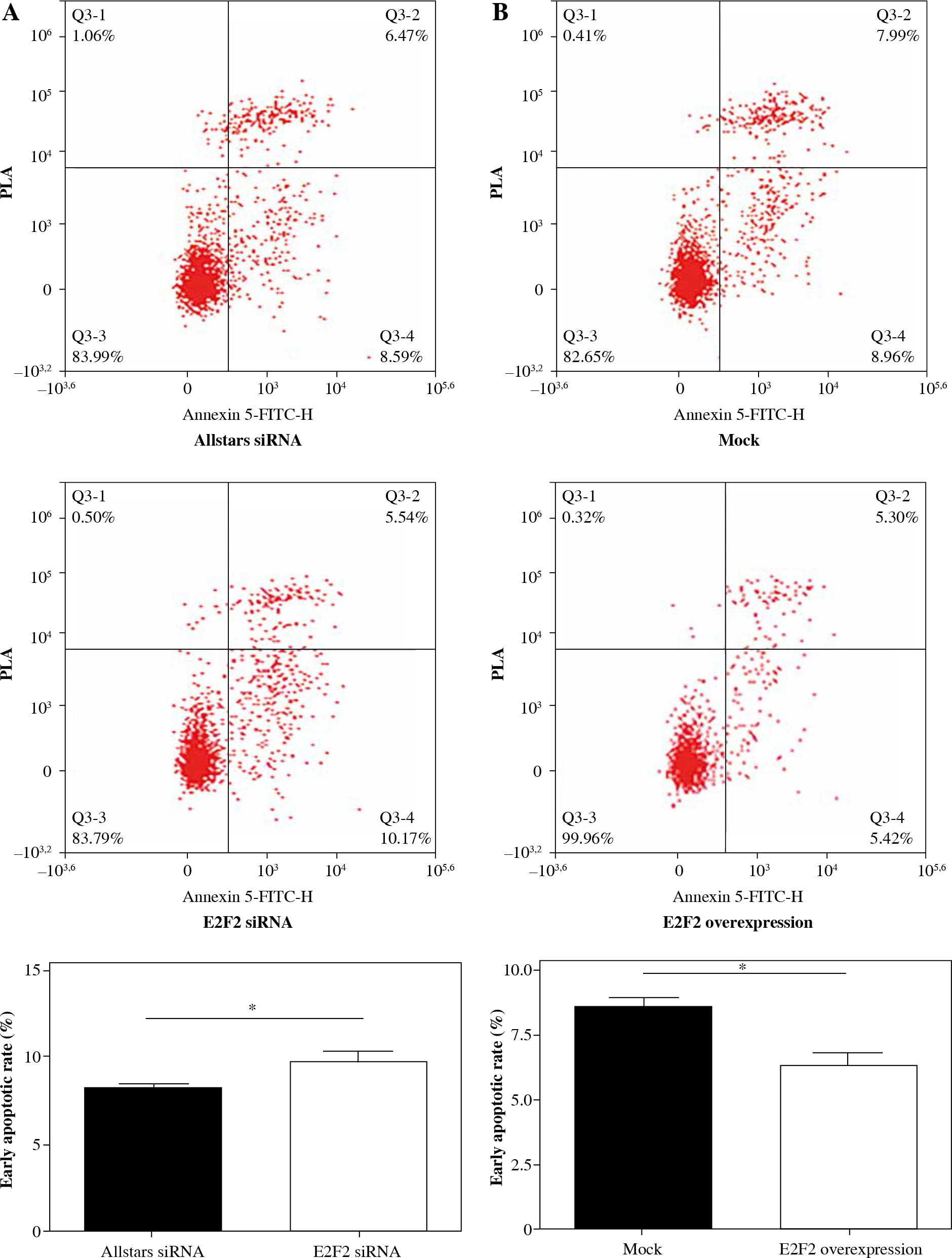 The effect of E2F2 expression on apoptosis of RASF using flow cytometry assay. A) Apoptosis of RASF with transfection of anti-E2F2 siRNA or Allstars siRNA was measured, and the result is depicted in one map. B) Apoptosis of RASF with transfection of E2F2 expressing plasmids or blank plasmids (mock) was measured, and the result is depicted in one map. *p < 0.05